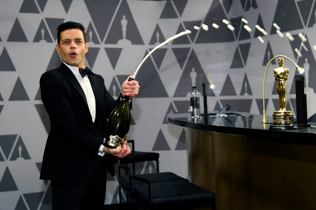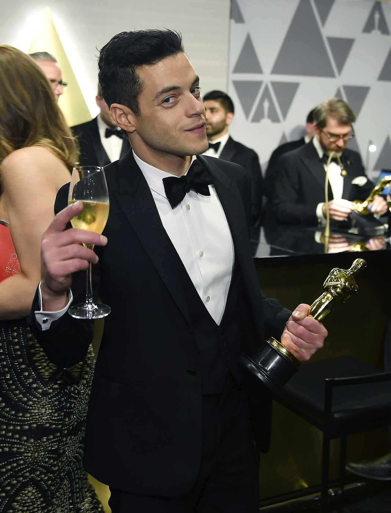 その後向かったプレスルームでは、用意されていたシャンパンのボトルを勢いよくオープンし、報道陣たちに向かってシャンパンシャワーを浴びせていたラミ。オスカー像片手に満足そうにシャンパンを口にしていた。無事で何より! (フロントロウ編集部)