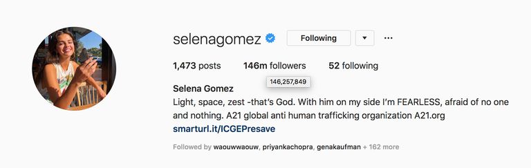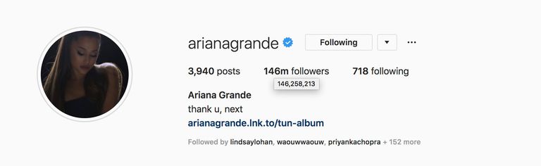 四捨五入すると「146M(1億4,600万人)」でタイになってしまうが、端数までチェックするとセレーナよりアリアナのほうが、フォロワー数を上回っているのが確認できる。