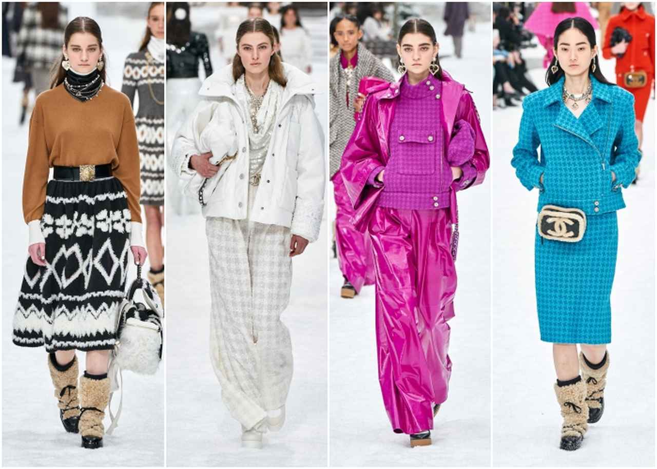 チェックや千鳥格子柄を組み合わせたメンズライクなオーバーサイズシルエットのスーツや、雪をイメージしたふんわりとしたモヘア素材のニットやフェザーを使った丸みのあるスカート、北欧風のノルディック柄のニットドレス、雪景色に生えるビビッドカラーのスポーティーなワークウェアなど、カールの遊び心や力強い女性像への敬愛を感じるアイテムの数々を身に着けたモデルたちが、人工雪が降り積もったランウェイを歩いた。