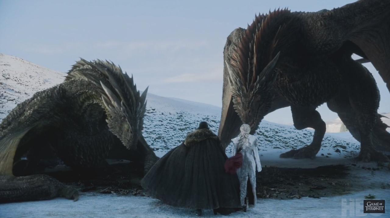 それは、ジョンとデナ―リスが2頭のドラゴン、「レイガル」と「ドロゴン」と向かい合うこちらの1コマ。