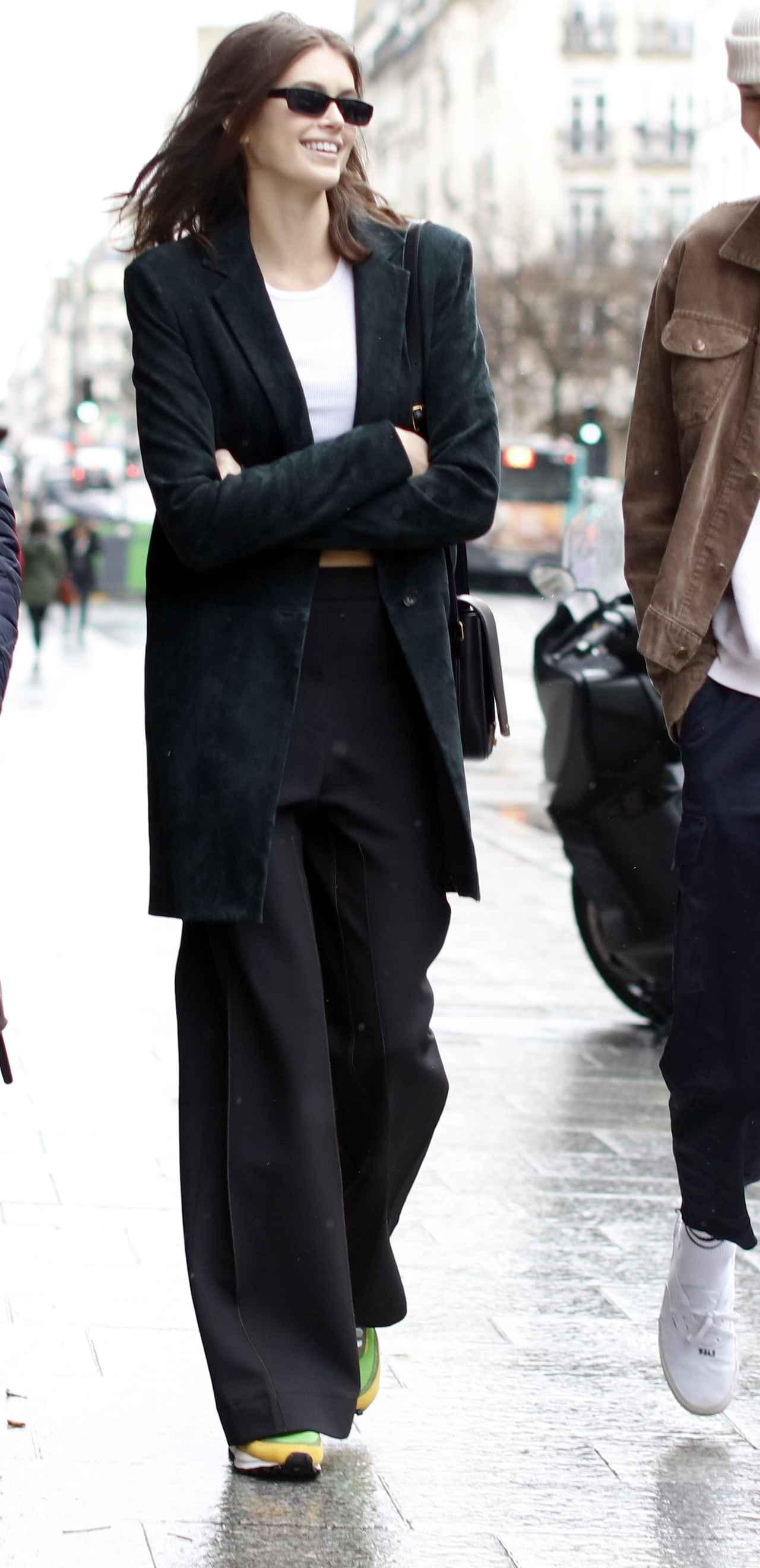 カイアはThe Rowのマニッシュなジャケットに、ショート丈のTシャツを合わせスキニーサングラスをかけた旬なスタイル。ブラックのパンツの足元には、ナイキ×サカイのコラボスニーカーでブラックコーデにアクセントをつけて。