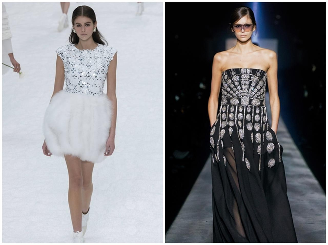 写真左より、シャネル、ジバンシィのランウエイを歩くカイア