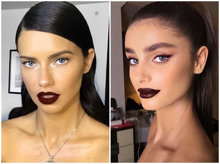 人気シンガーのセレーナ・ゴメス、人気モデルのテイラー・ヒルなどを担当するメイクアップ・アーティストのハン・ヴァンゴが手掛けたテイラーのメイクは、ボルドーカラーのダークリップと同じボルドーカラーのアイラインを目元に引いた、旬の「モノクロ・メイク」。