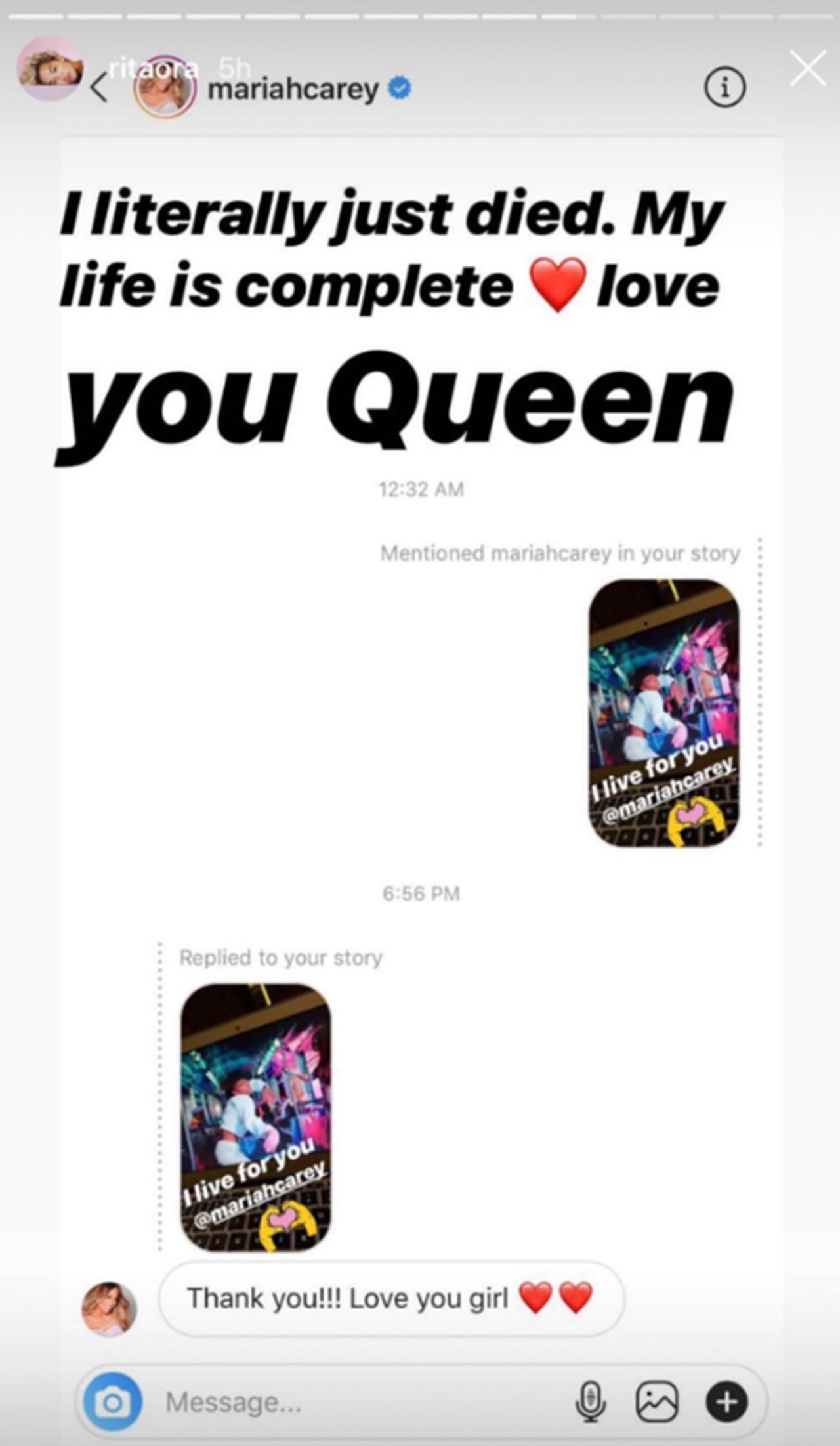 大好きなビッグスターから返信が来るとは思っていなかったのか、リタはテンションがあがってしまい、「まじで死んじゃう。人生の目標は達成したわ。愛しているわ、クイーン」と、マライアから返信があったことを明かし、その姿はまるでシンガーとしてのリタではなく、マライアのファンとしてのリタの姿だった。