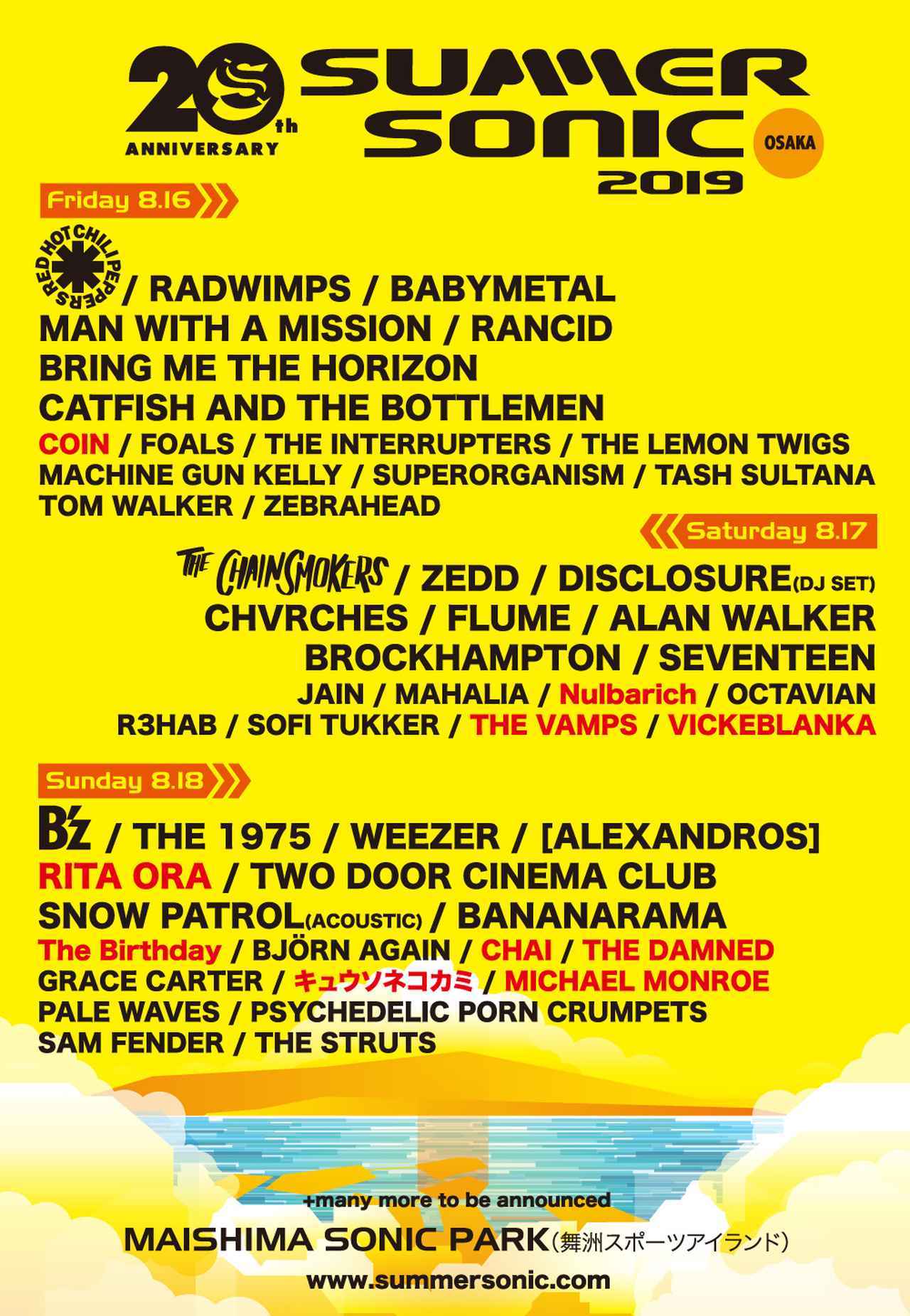 2019年のサマーソニックは、20周年イヤーということで、東京会場はZOZOマリンスタジアムと幕張メッセ、大阪会場は舞洲SONIC PARK(舞洲スポーツアイランド)にて、8月16日(金)から18日(日)にかけて10年ぶりの3日間開催することが決定しており、早くも盛り上がりを見せている。
