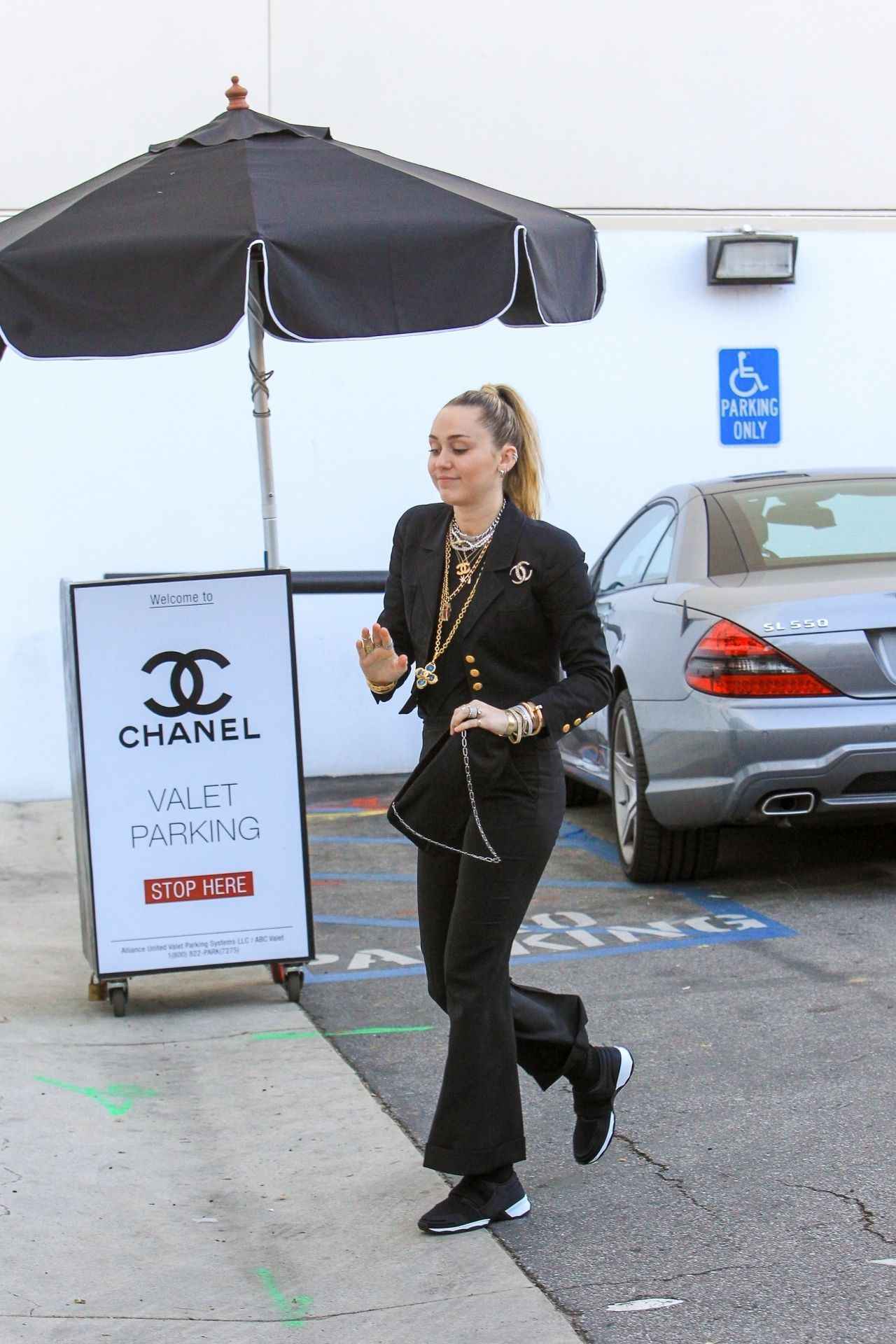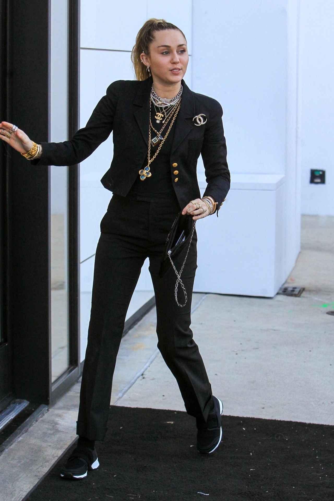 ブラックのジャケット&パンツに映える、シルバーとゴールドカラーの両方のカラーをミックスさせたセレブらしいアクセコーデ。足元のブラックスニーカーもシャネルで、全身を統一したマイリー。
