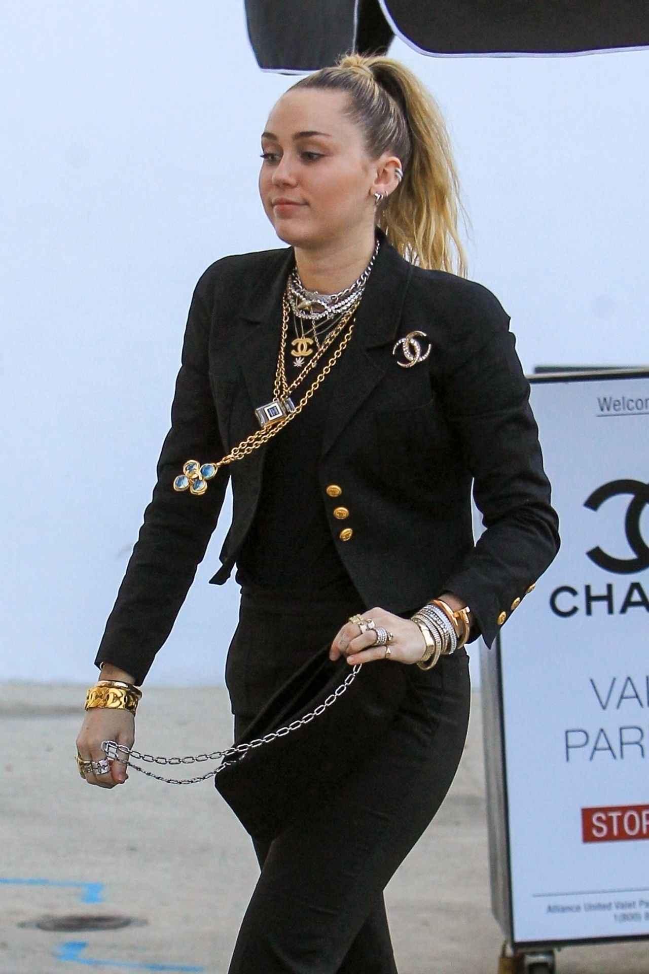 シャネルのビンテージジャケットに、同じくビンテージシャネルのピンバッジ、ネックレス、ブレスレットを重ねてつけたシャネルコーデを披露した、シンガーのマイリー・サイラス。