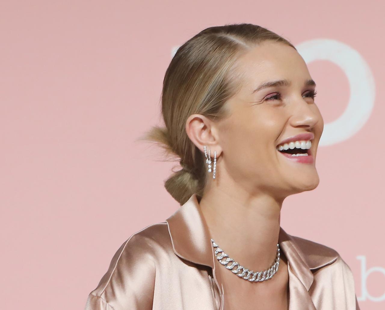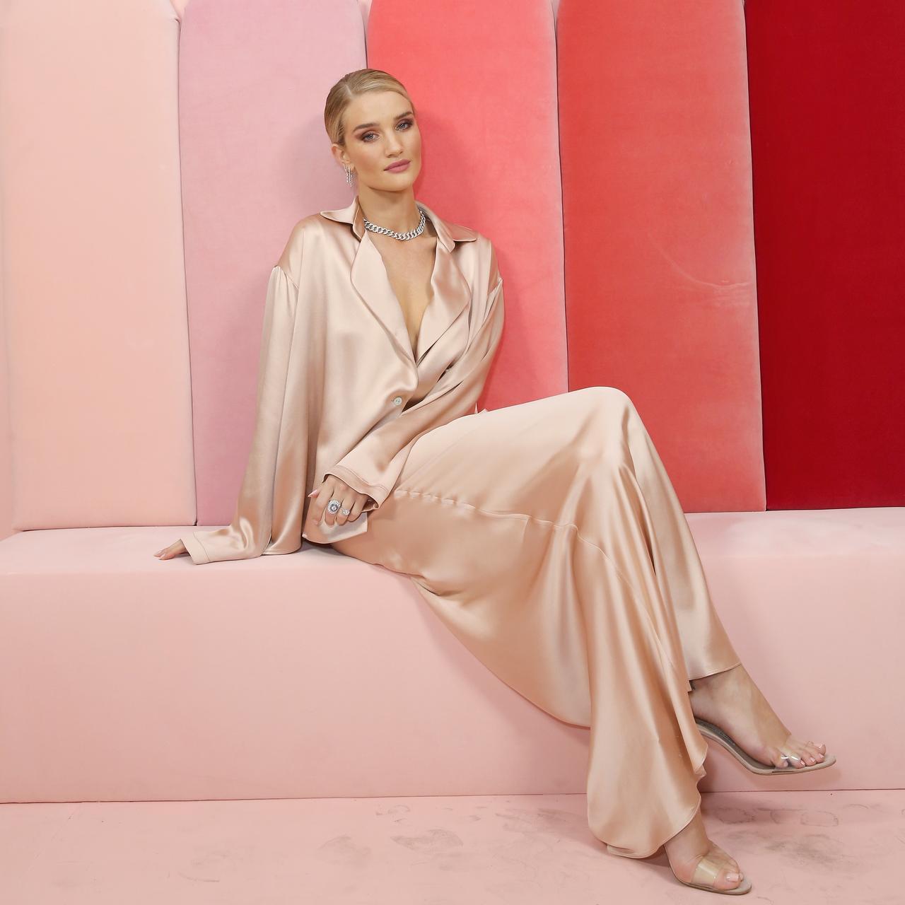 トップモデルのロージー・ハンティントン・ホワイトリーは、ペールピンクのシャツとロングスカートをセットアップで着用。