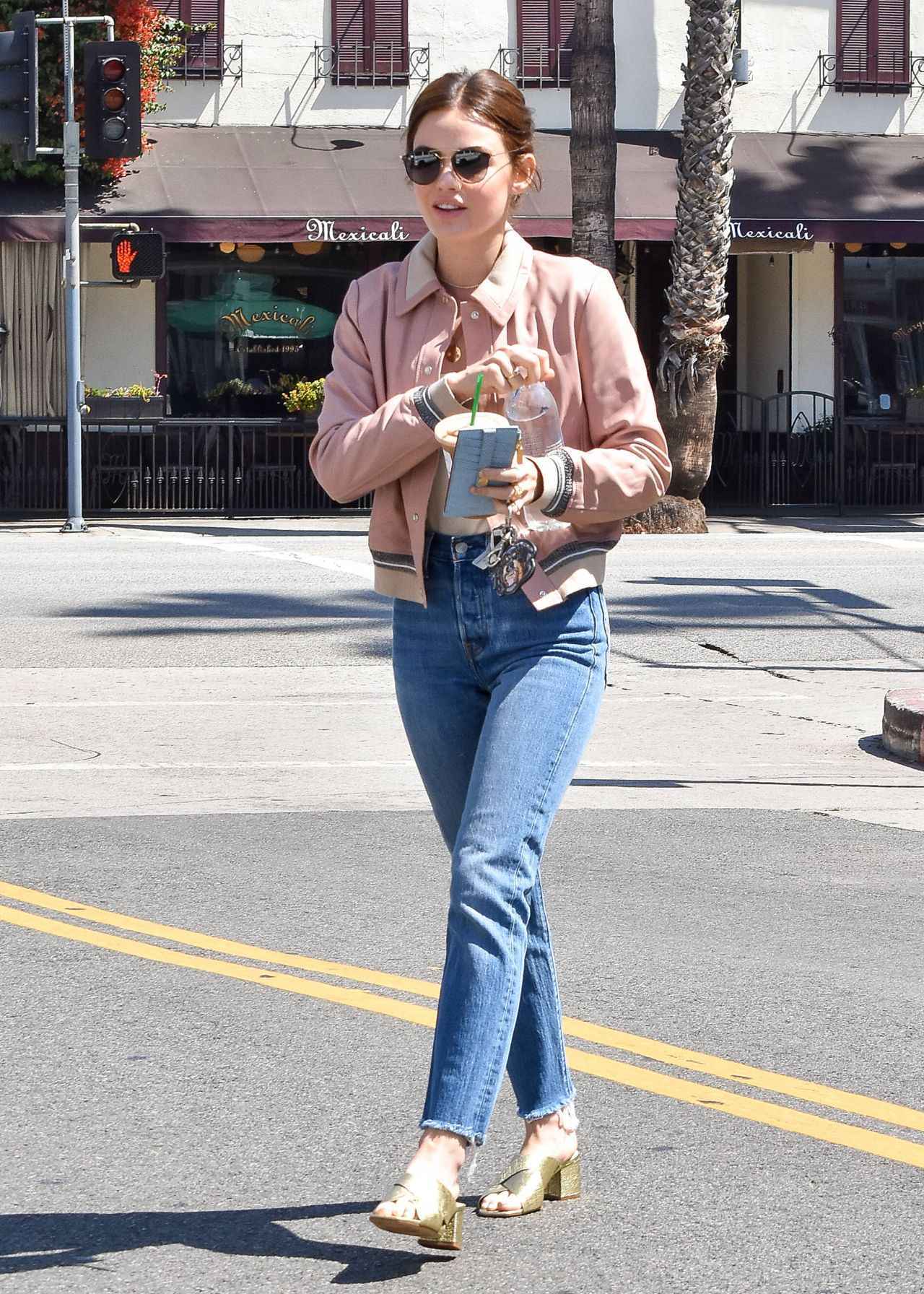 人気女優のルーシー・ヘイルは、セレブに人気のブランドSandro(サンドロ)のペールピンクのボンバージャケットに、Levi’s(リーバイス)のデニムを合わせたカジュアルコーデ。