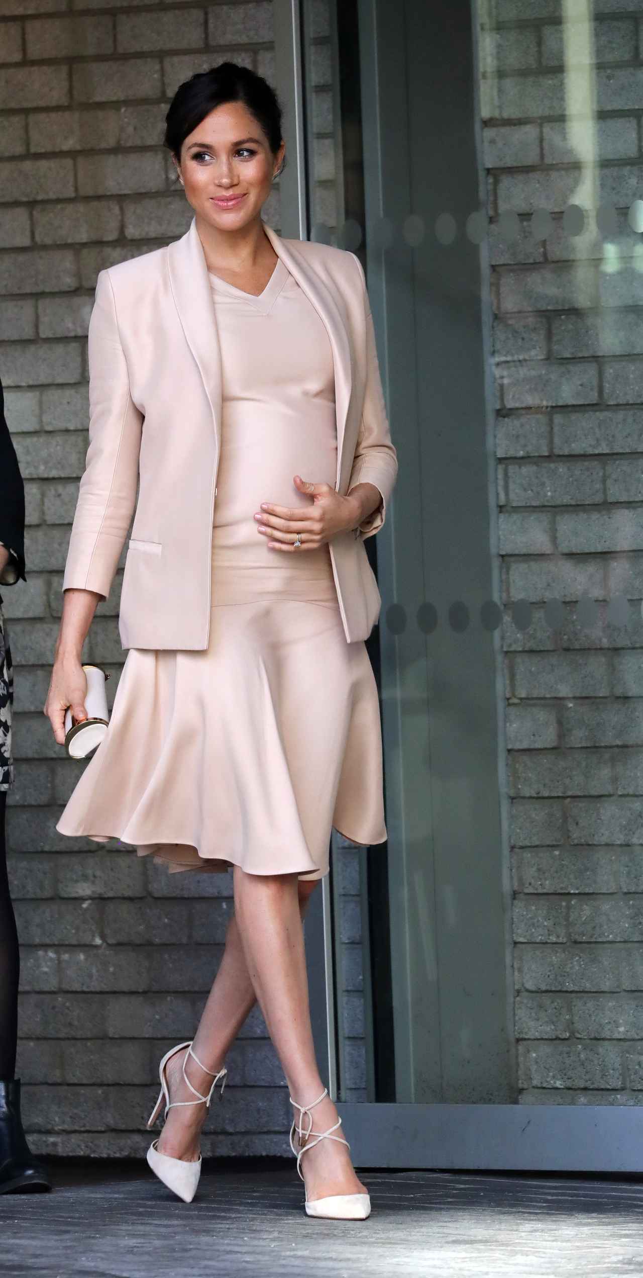 イギリス王室のメーガン妃は、ペールピンクのワンピースにジャケットを羽織ったきれいめスタイルを披露して。