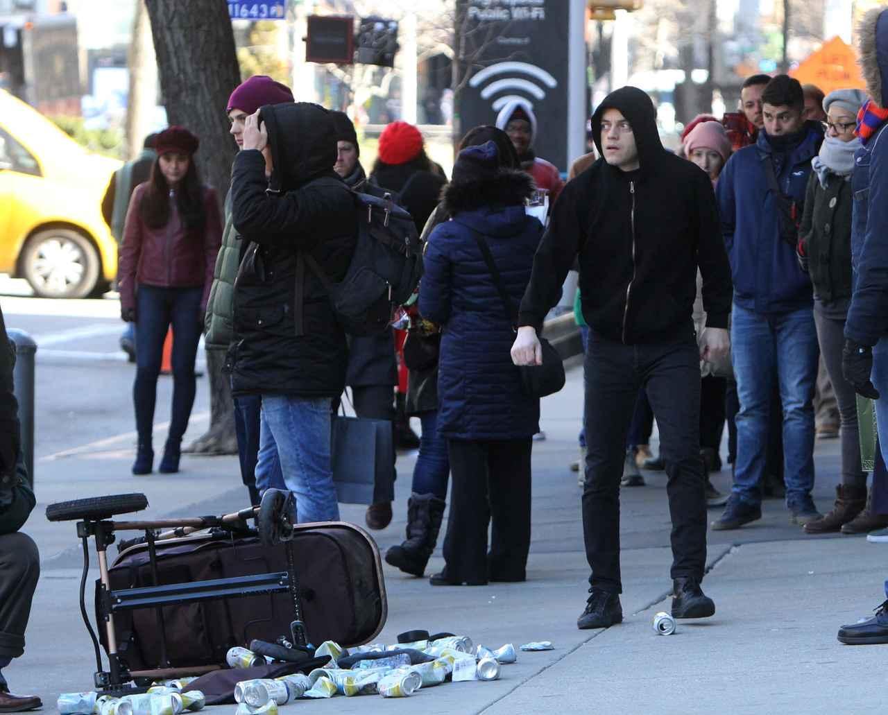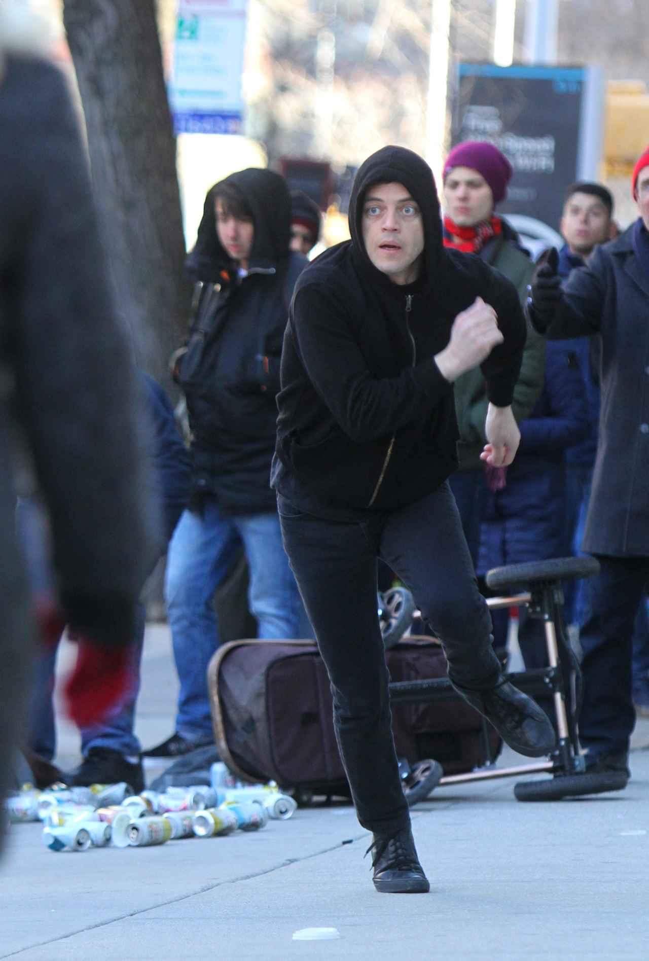 写真でお分かりの通り、これはドラマ『MR.ROBOT / ミスター・ロボット』の撮影。ラミが天才ハッカーのエリオット・オルダーソン役を演じる主演ドラマの新シーズンの撮影現場の様子である。