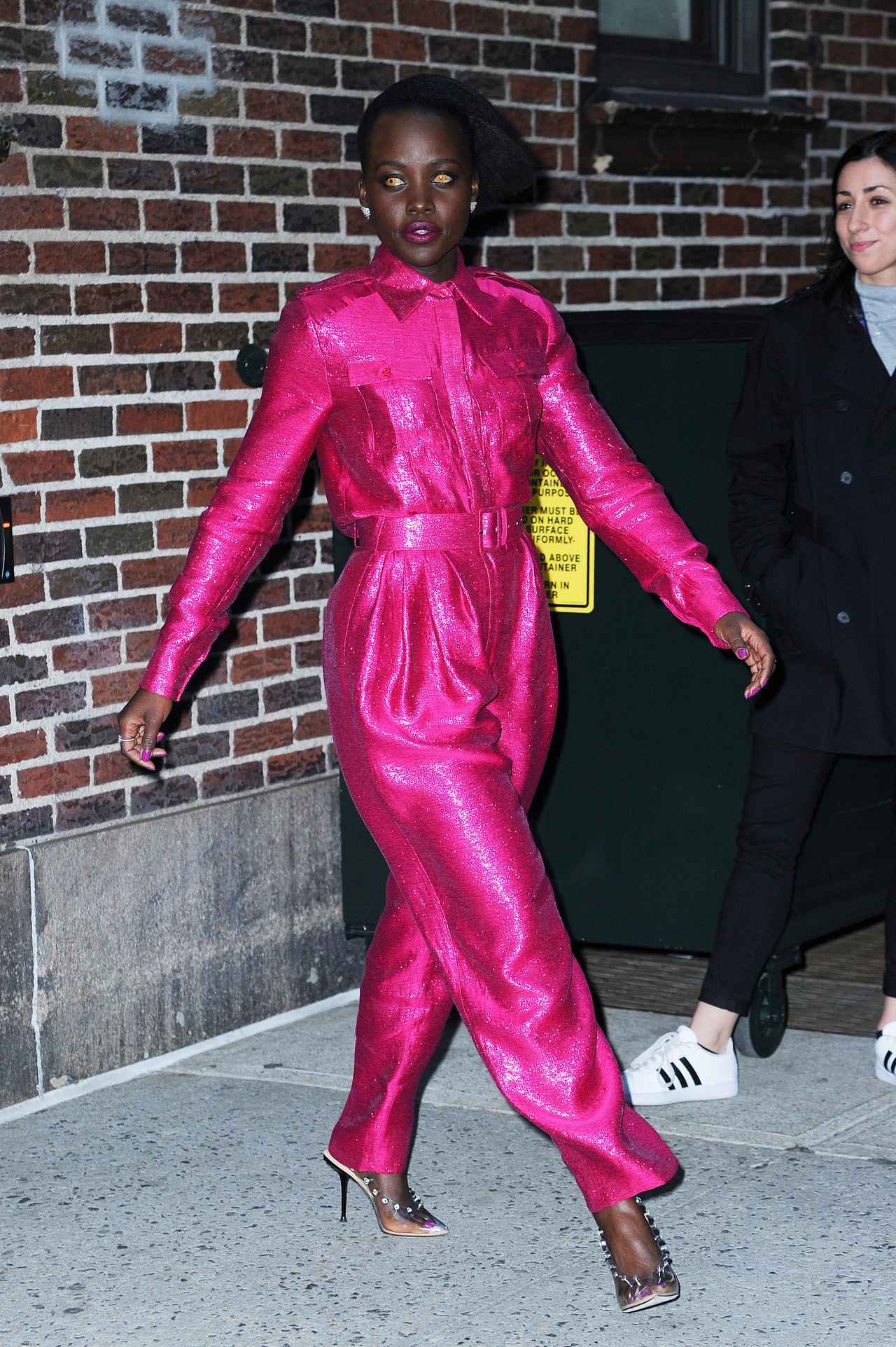 新作ホラー映画『Us(原題)』のPRのため同トーク番組に出演したルピタは、ビビッドピンクのジャンプスーツにスタッズつきのクリアヒールを着用した姿で外にでてきた。