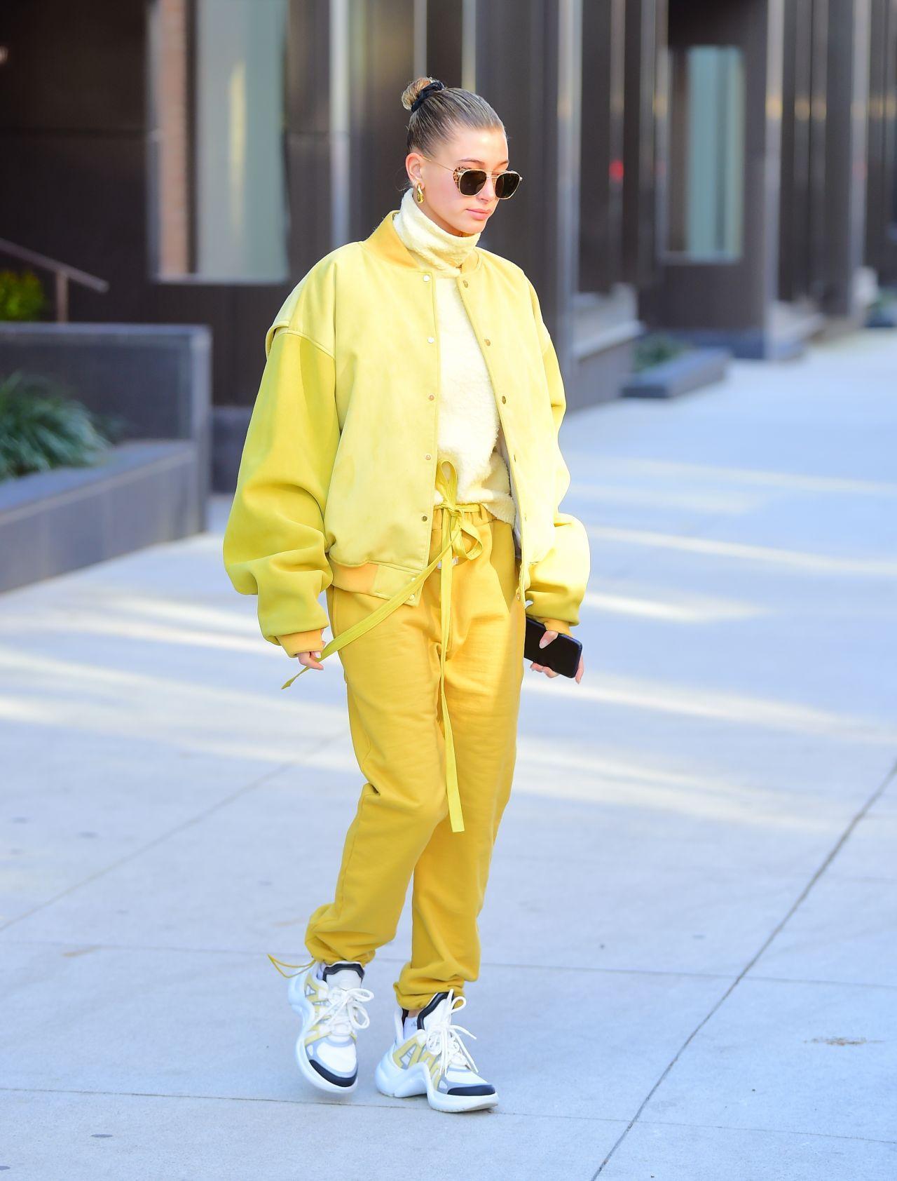 ポップなイエローカラーで全体を統一した、話題のモデルヘイリー・ビーバー。足元にはブラックとイエローのカラーリングのアクセントが効いた、ハイテクスニーカーで旬なストリートスタイルを作って。