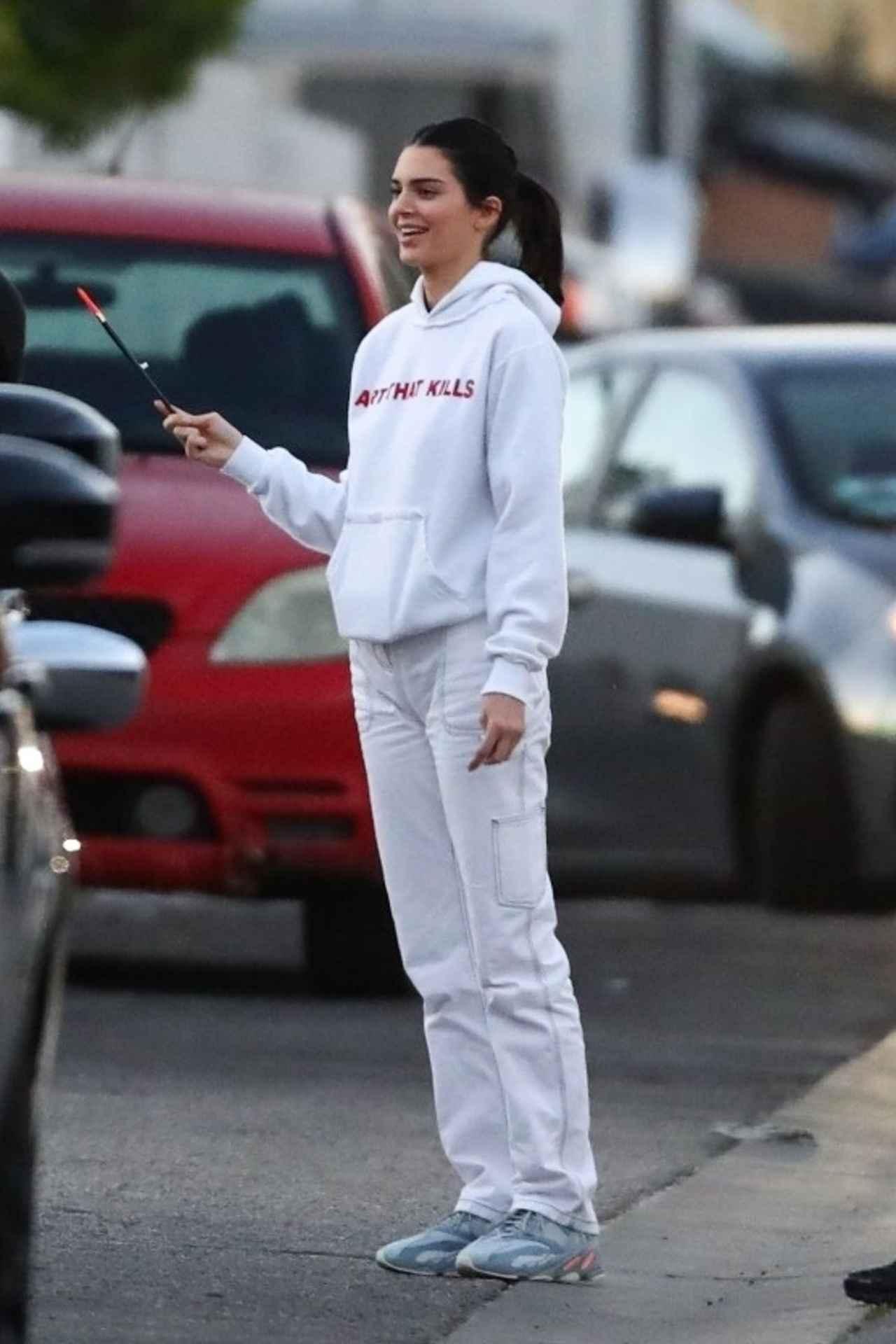 ストリートスタイルに定評があるトップモデルのケンダル・ジェンナー は、白のフーディ×白パンツの春らしいホワイトコーデのアクセントに、Yeezy(イージー)のハイテクスニーカーをON。