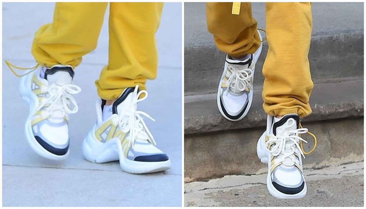 イエローのボンバージャケットとパンツはFear of God(フィアーオブゴッド)、大胆な波型のアウトソールと大きめの舌革が特徴なハイテクスニーカーはLouis Vuitton(ルイ・ヴィトン)のもの。