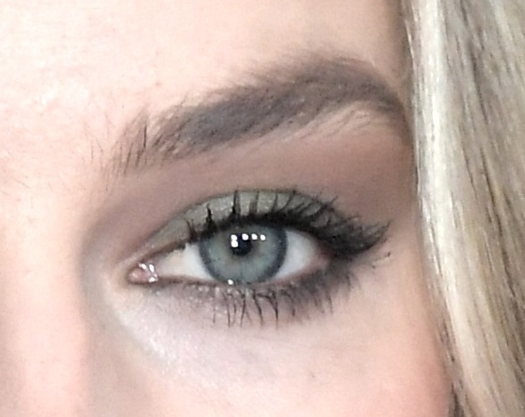 上まぶたには、瞳のカラーとなじむスモーキーなブルーグリーンのアイシャドウ。下まぶたにはグレーのアイシャドウ。霧がかかったように目の周りにぐるっとトープのアイシャドウをぼかしている。