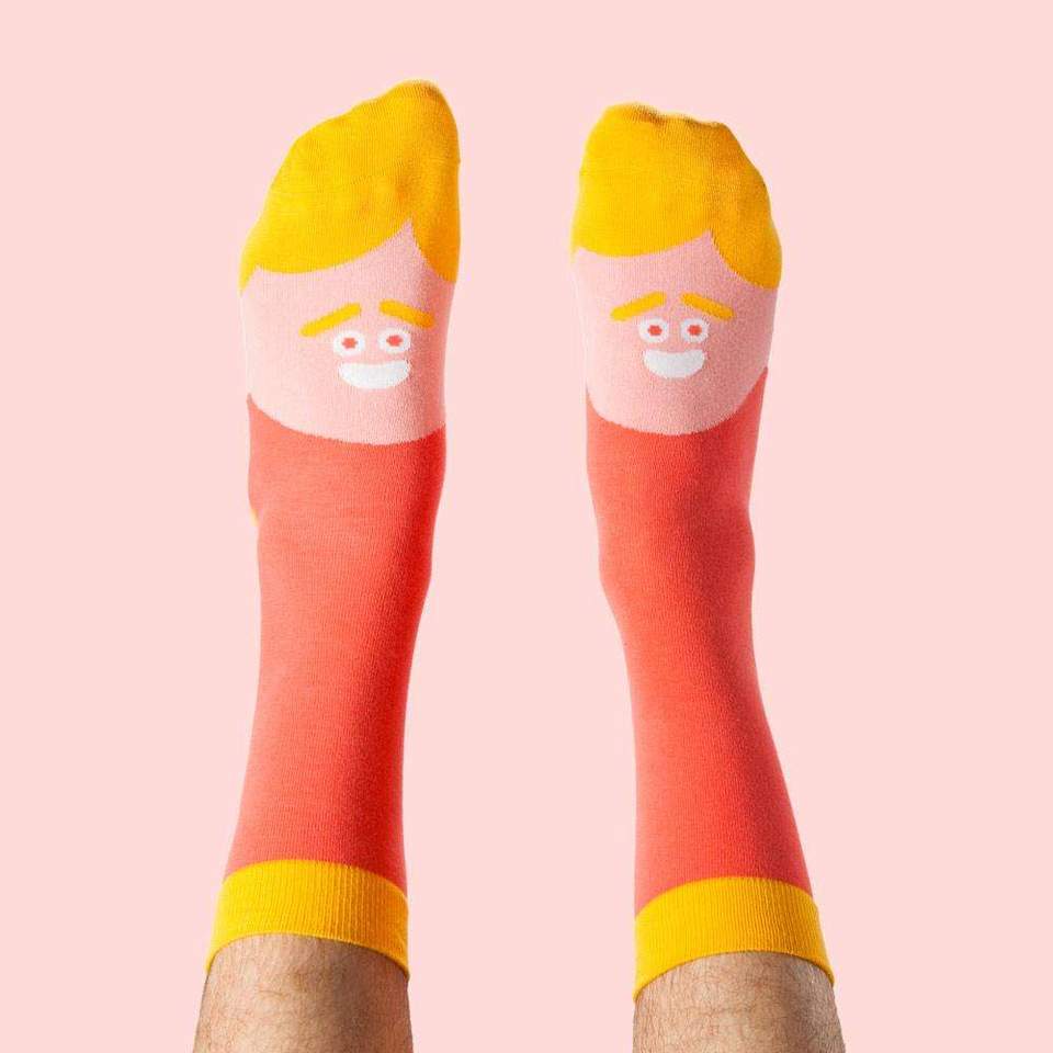 キャサリン妃のフルネームであるケイト・ミドルトンを文字って「ケイト・ミドルトゥ(足の中指)」、メーガン妃のフルネーム、メーガン・マークルを文字って「メーガン・アンクル(足首)」と名づけられたソックスは、いずれも微妙な表情のニュアンスがそれぞれの特徴をばっちりと掴んでいる。