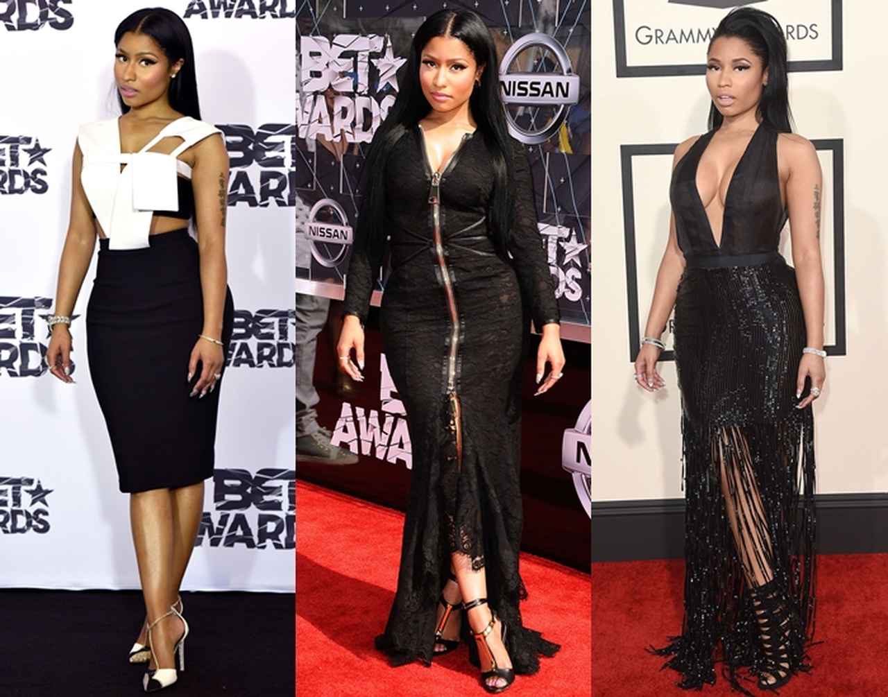 ラッパーのニッキー・ミナージュは、控えめな装いのときはポーズも上品に。体をカメラに対して正面に向けるのではなく、あえて斜めに立ち、右脚が前にくるよう脚をクロスして顔だけカメラに向けるのが定番。