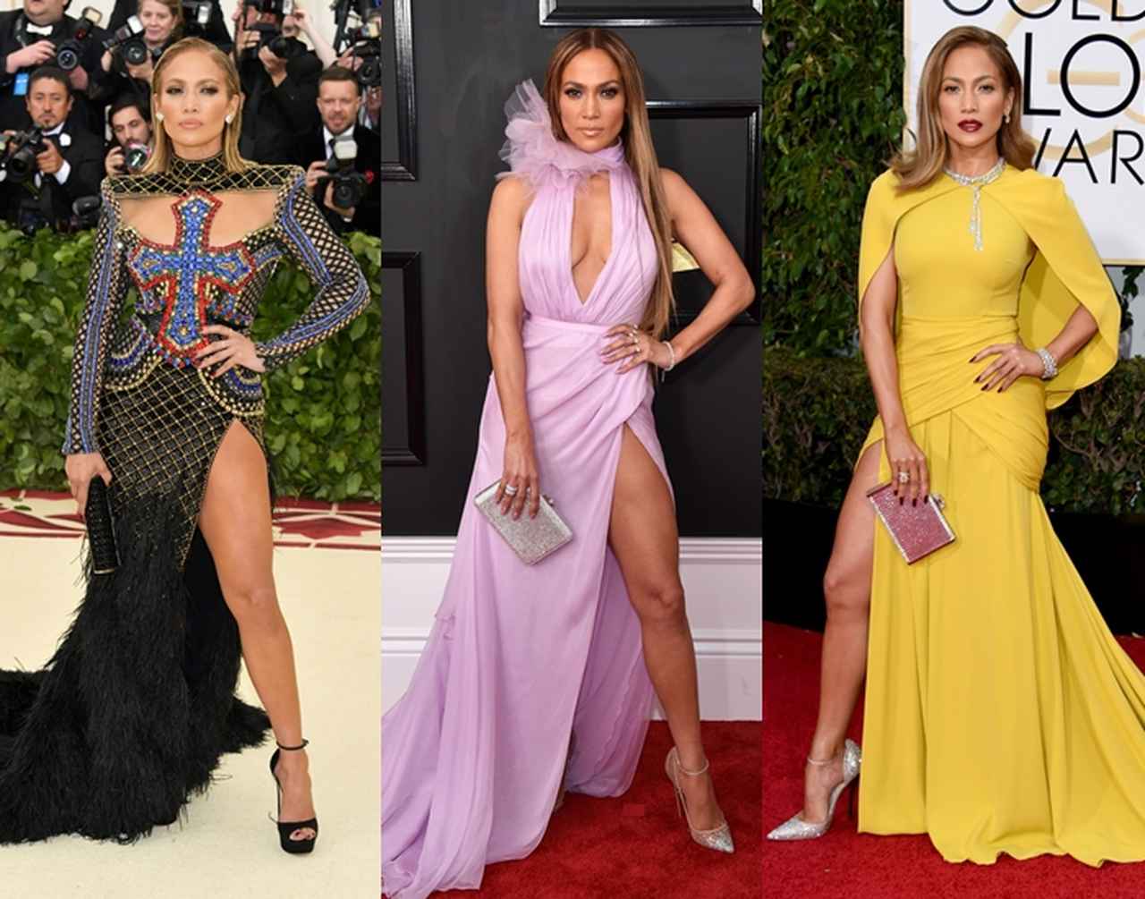 ストリッパーを熱演した映画『ハスラーズ』で第77回ゴールデン・グローブ賞の助演女優賞にノミネートを果たしたラテン系歌姫のジェニファー・ロペスのお決まりのポーズはダンスで鍛えぬいた美脚を深めに開いたスリットからニョッキリと覗かせるこちらのポーズ。クラッチバッグは前めに持って、ネイルやアクセサリーを見せるのも忘れない。