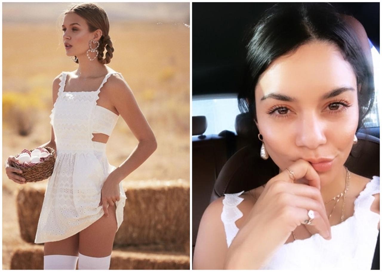 女優のヴァネッサ・ハジェンズのお気に入りブランドのひとつ、フォーラブ・アンド・レモンズ(For Love & Lemons )。そんなお気に入りブランドの白レースのエプロンワンピが、ヴァネッサのイメージにぴったりマッチしてキュート。