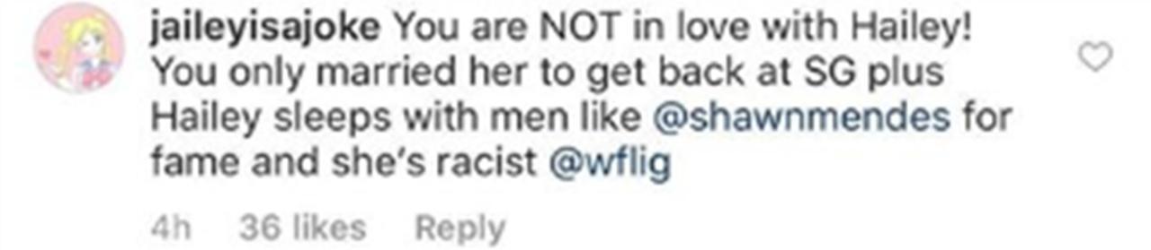 きっかけは、ジャスティンのインスタグラムに「Jailey is a joke(ジェイリーとかアホくさ)(※)」というアカウント名の人物が、「あなたはヘイリーのことを愛してなんかいない!ヘイリーと結婚したのはセレーナの気を引くためだった。ヘイリーは売名のために、ショーン・メンデスのような有名人と寝るような女よ。それに人種差別者だし」と、コメントしたことにある。