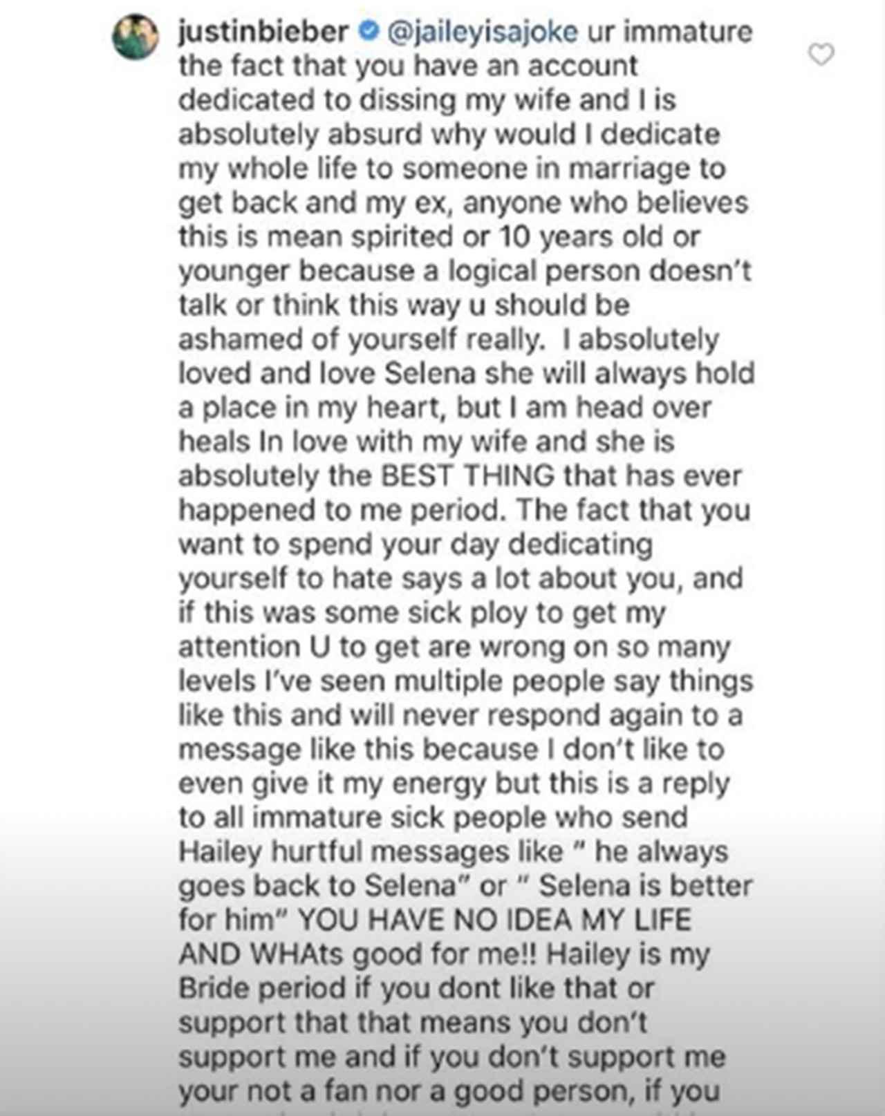 君が1日のほとんどを悪口に費やしていることが、まさに君がどういう人間なのかを物語っている。もし仮に君のこれまでの言動が僕の気を引くための策略だったんだとしたら、君は色々な意味で間違っている。今まで同じようなメッセージを山ほど目にしてきたけど、こんな風に僕が返事をすることはこの先一生ないだろう。無駄な労力を費やしたくないからね。これはヘイリーに対して『彼はいつかセレーナのもとに戻る』とか、『セレーナのほうが彼にふさわしい』といった心ない言葉を浴びせる、幼稚で低能な人たち全員に向けた僕からの警告だ。君たちは僕のことも、僕にとって何がベストなのかも一切知らない!!