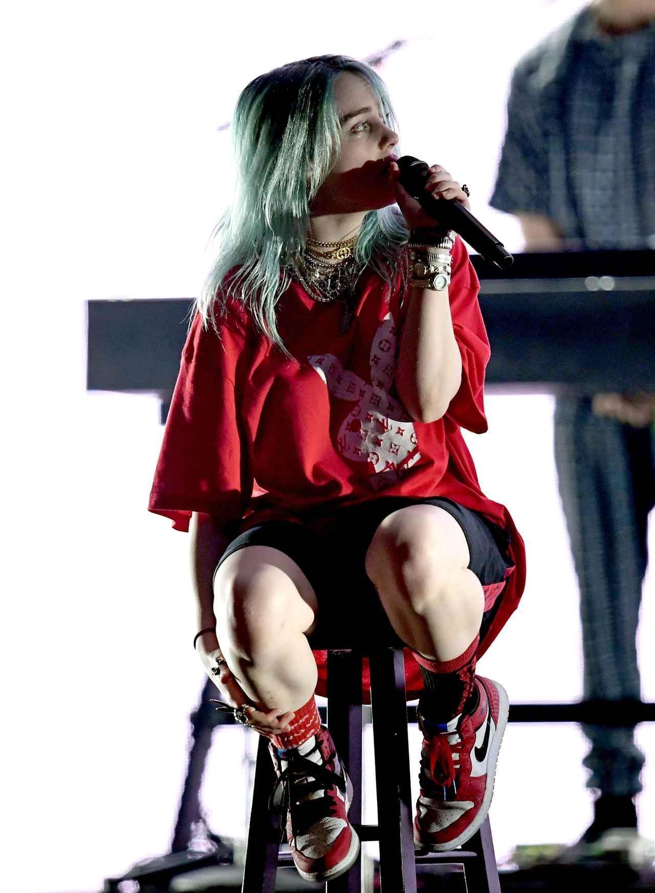 パフォーマンスのファッションも人気を集めるビリーは、ルイ・ヴィトン×プレイボーイという、目を引くパロディTシャツを着用して。