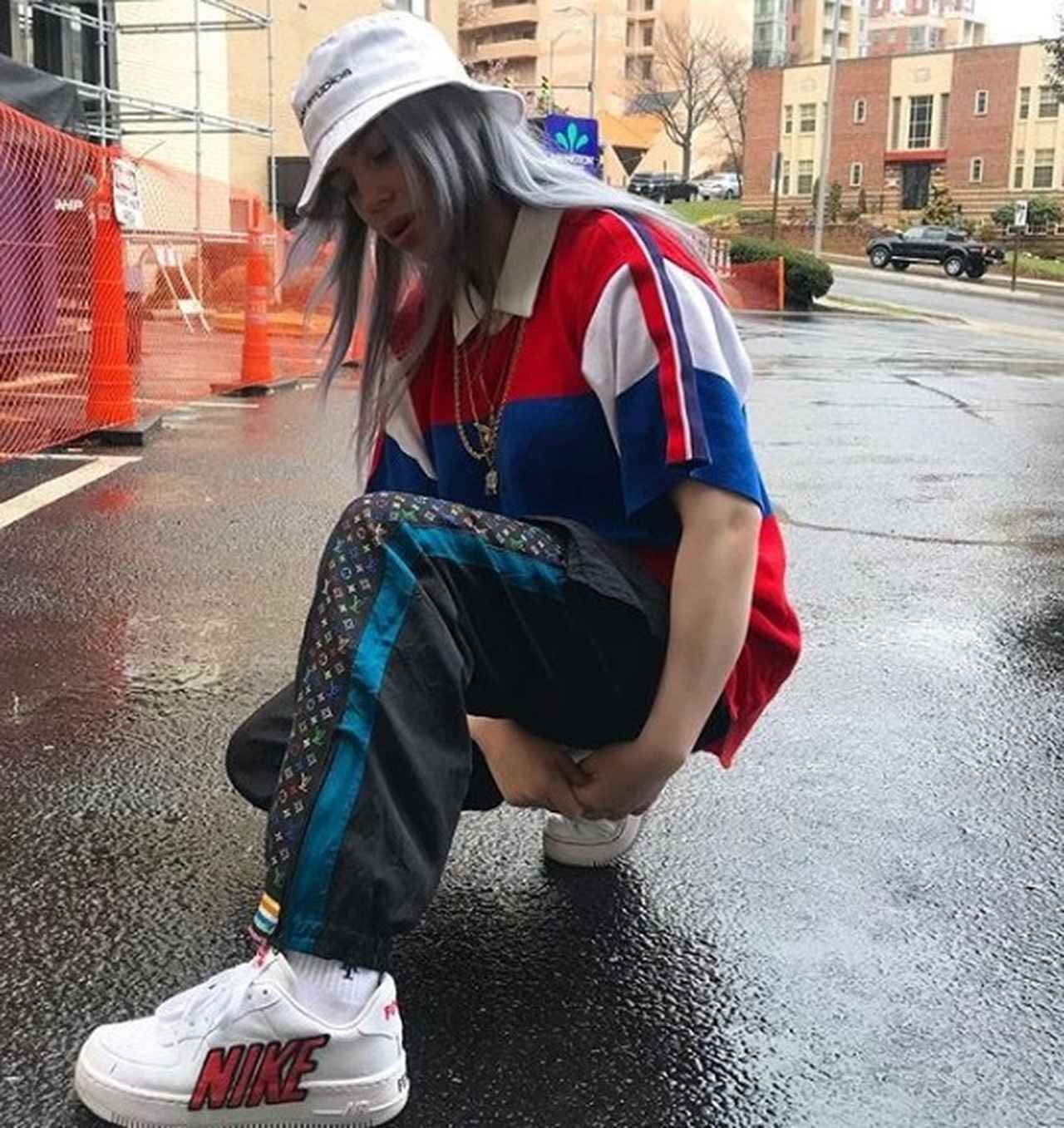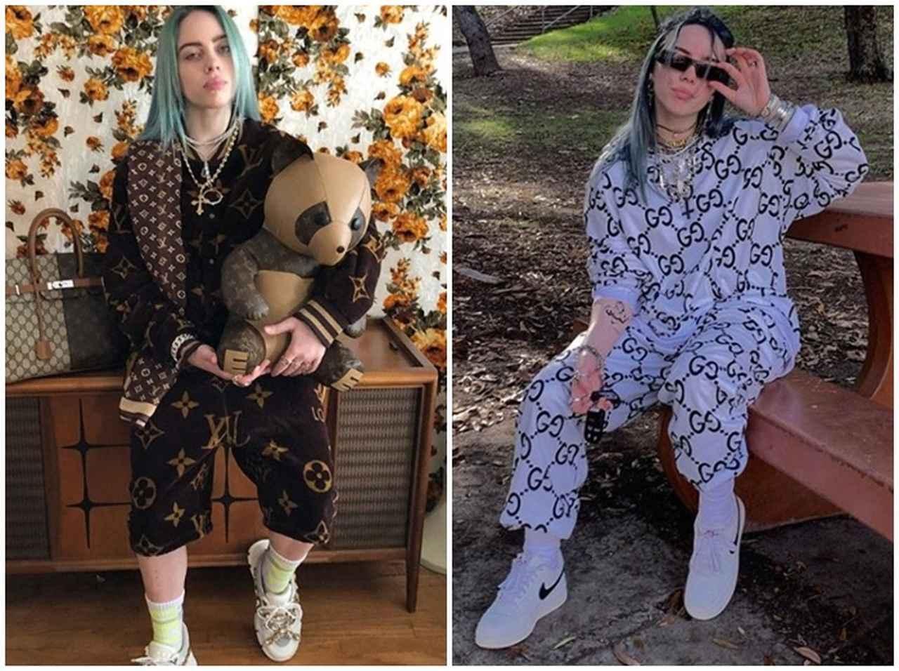グッチ×ルイ・ヴィトンのロゴがミックスされたエルメスのバーキンバッグというユニークなバッグや。全身ブランドロゴのアイテムをポップに着用するビリー。