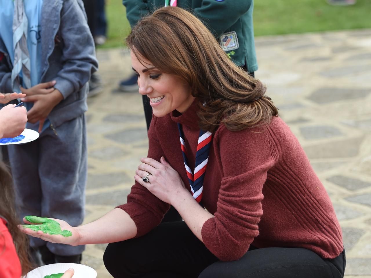 キャサリン妃は少女たちと話したあとは、他の子供たちと、手で絵を描くハンドペイントを手が緑になるほど楽しんでいた。