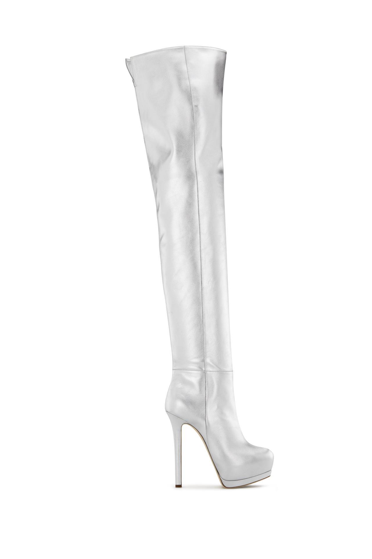 #1 ソフトなメタリックシルバーのレザーニーハイブーツ