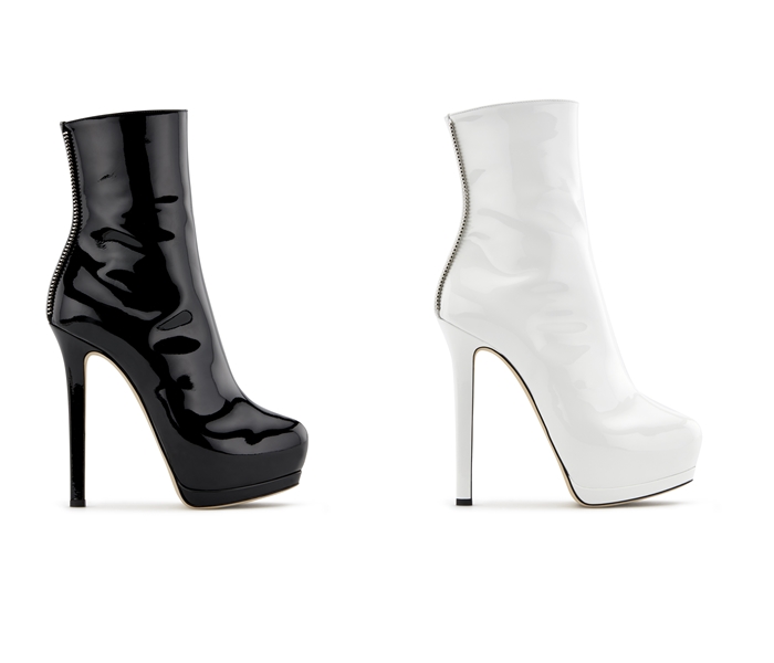 パテントレザーのアンクルブーツにアリアナのお気に入りのプラットフォームを組み合わせたスタイル。ヒールにはジュゼッペ・ザノッティのシグネチャーのジップディテールをあしらい、演出に合わせ、白と黒の2色で制作。