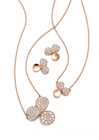 新作は、アイコニックなフラワーモチーフを18Kローズゴールドで表現。有機的なフラワーはピンを中心に形成され、グラフィカルでモダンな視点で再解釈。ローズゴールドの花びらには、ラウンド ブリリアント カットのダイヤモンドが煌めきを放つ、美しいデザインに仕上がっている。