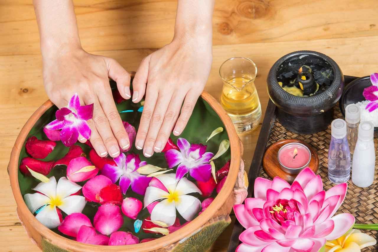 2 エッセンシャルオイルを加えたお湯に手を浸す