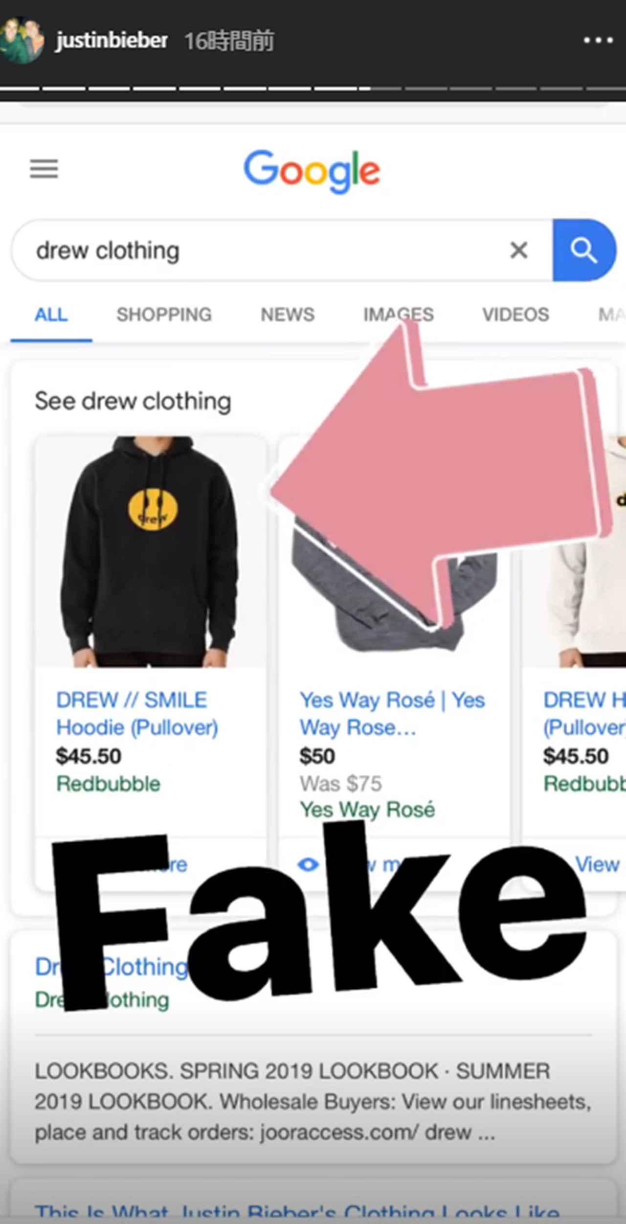 ネットで流出しているドリュー・ハウスの偽物を発見したジャスティンは、自身のインスタグラムに偽物の商品画像の上から「FAKE(ニセモノ)」とデカデカとコメントして、ファンに向けて注意を促した。