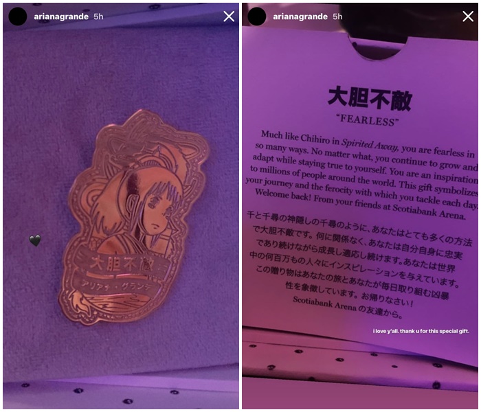 トロントの公演に訪れたファンからもらったプレゼントは、『千と千尋の神隠し』の主人公のデザインの上に、「大胆不敵」という文字とカタカナで「アリアナ・グランデ」と書かれたバッヂ。