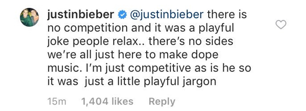 「ただふざけてジョークを言っただけで、僕たちは別に争ってるわけじゃない。だからみんな落ち着いて。バトルなんか存在しないし、僕たちは最高にイケてる曲を作ろうとしてるだけなんだ。僕も彼と同じくらい競争心が強いから、(アイスホッケーの専門用語を使って)ちょっとからかっただけさ」
