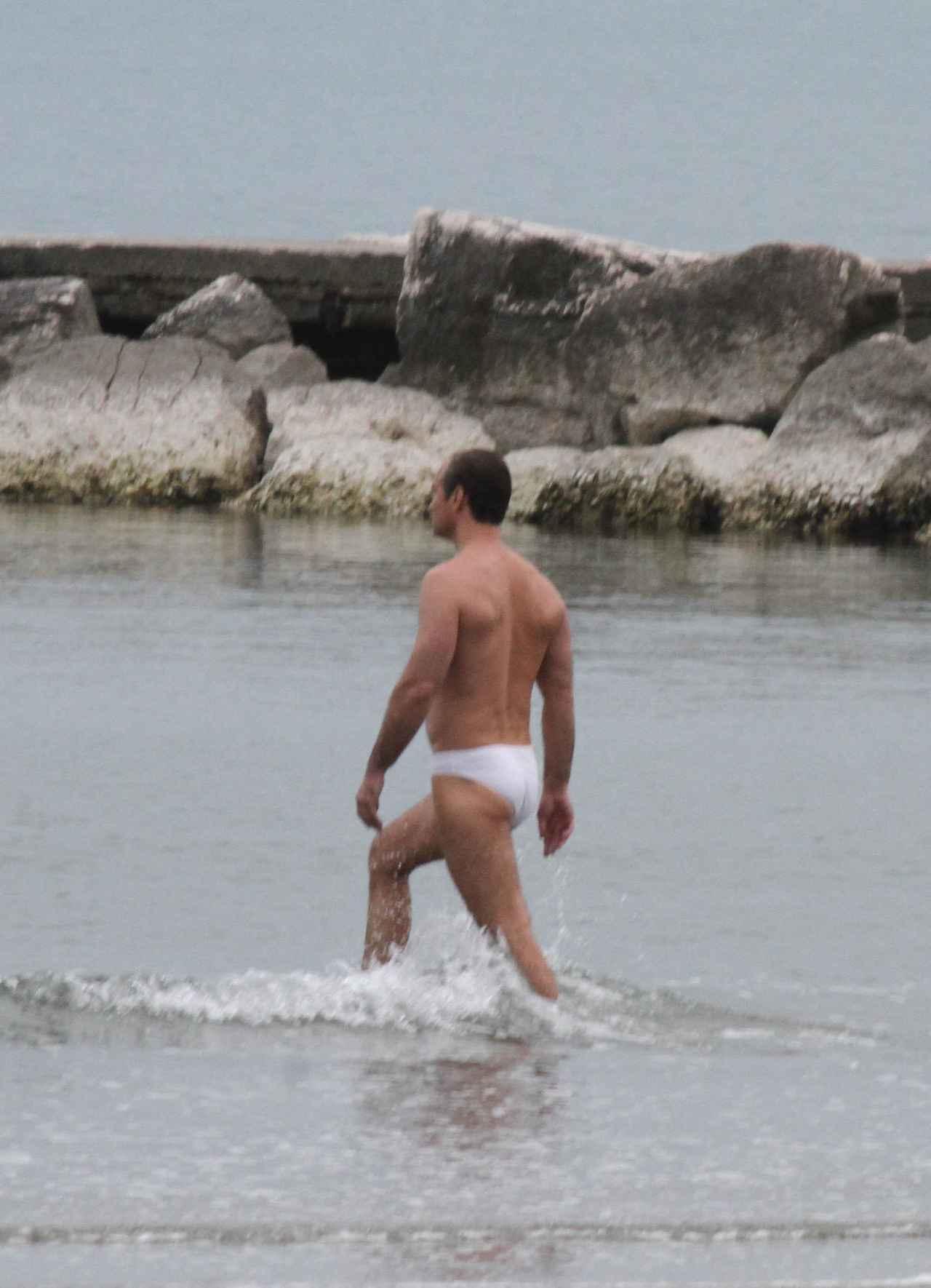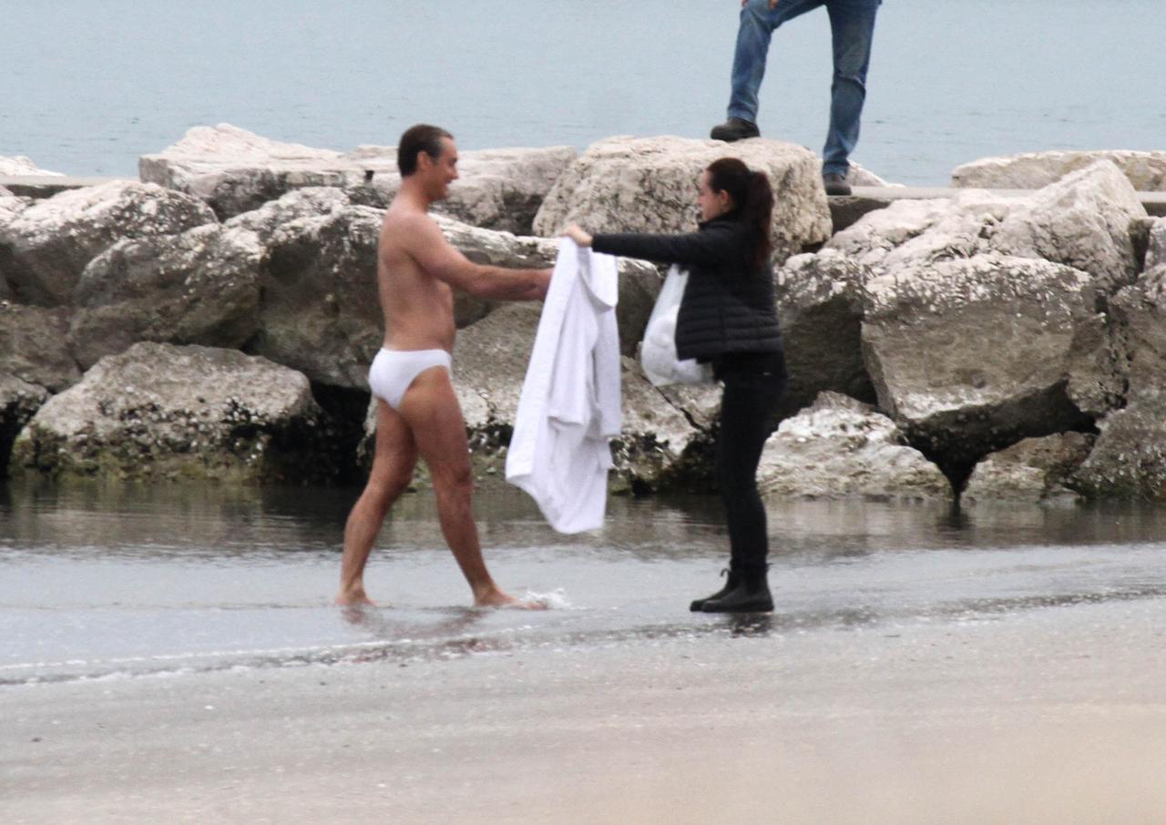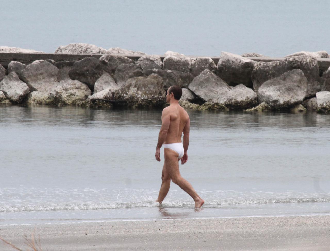 カリスマ的でミステリアスなローマ教皇を演じるジュードは、この日、Speedo(スピード)の純白のブリーフ水着だけを着用。この日は薄いダウンジャケットが必要なほどの気温だったが、ブリーフ姿のジュードは寒さを感じないほど堂々とした風貌で海に入った。