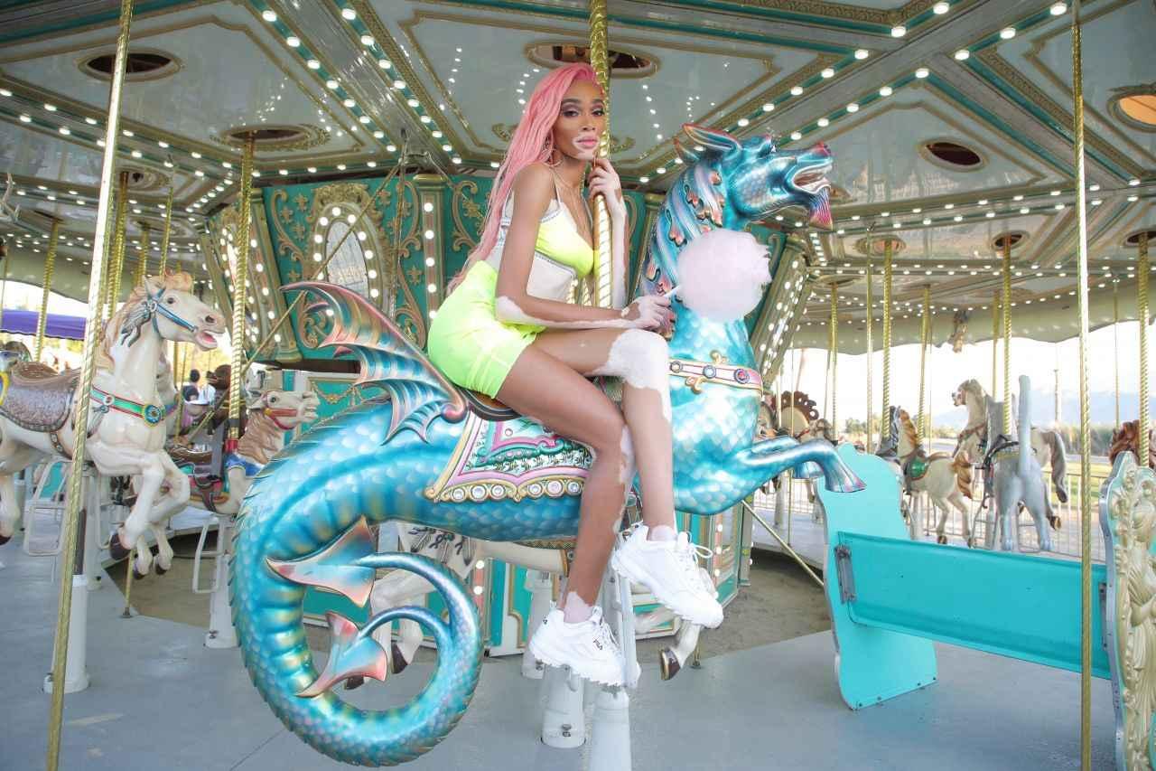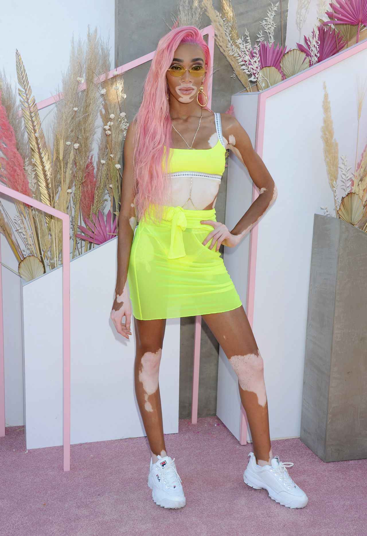 世界的に活躍中のまだら肌を持つモデル、ウィニー・ハーロウは、旬なネオンのセットアップに、ヘアカラーもピンクでポップにコーデ。