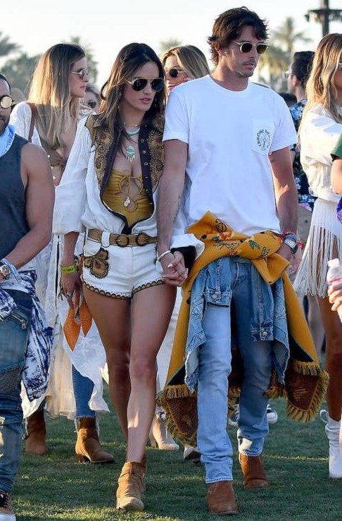 フェスファッションに定評がある、トップモデルのアレッサンドラ・アンブロジオは、エスニックなオールインワンから、ビーチウエアを覗かせたフェスらしいスタイルで、ファッション業界で働く恋人とコーチェラデート。フェスの芝生にも映えるブラウンのショートブーツは、フェスラバーの人気アイテム。