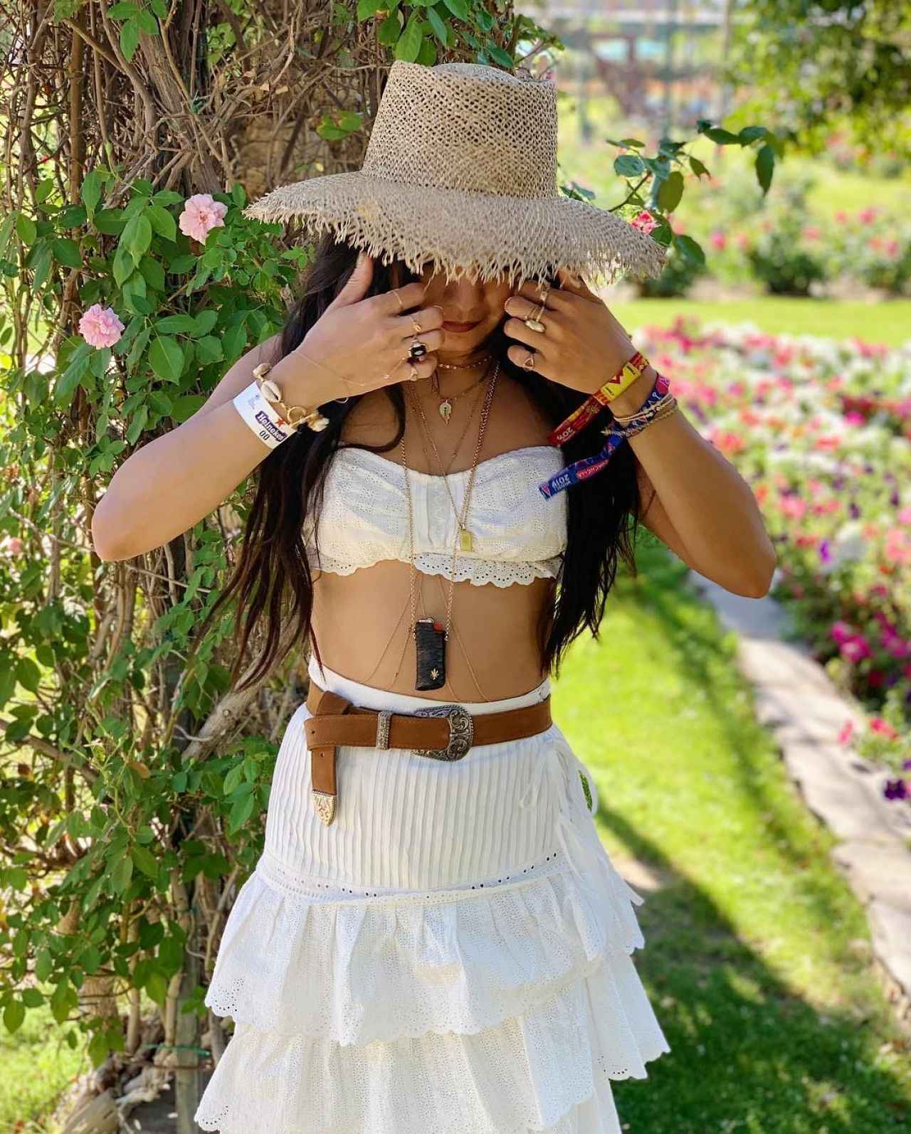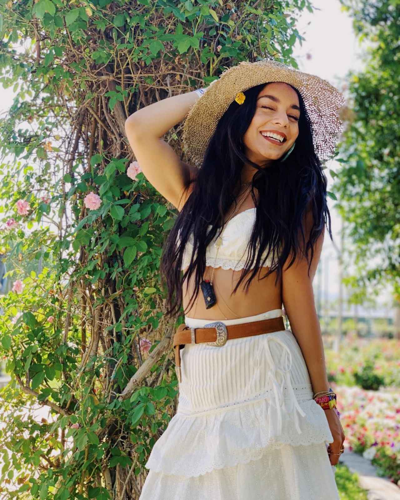 ヴァネッサが今年選んだのは、爽やかなホワイトコーデ! 注目のブラトップ+マキシ丈のスカートを合わせたセットアップのスタイルが、グリーンの芝生に映えてキュート。