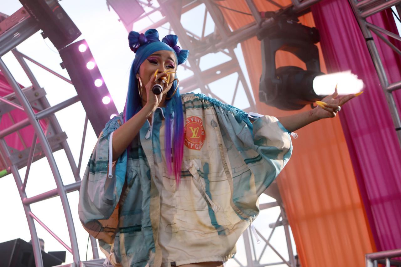 ブルー系のグラデーションヘアでリボンを作り、ルイ・ヴィトンのジャケットを合わせた人気ラッパーのカーディ・Bがサプライズアーティストとして登場!