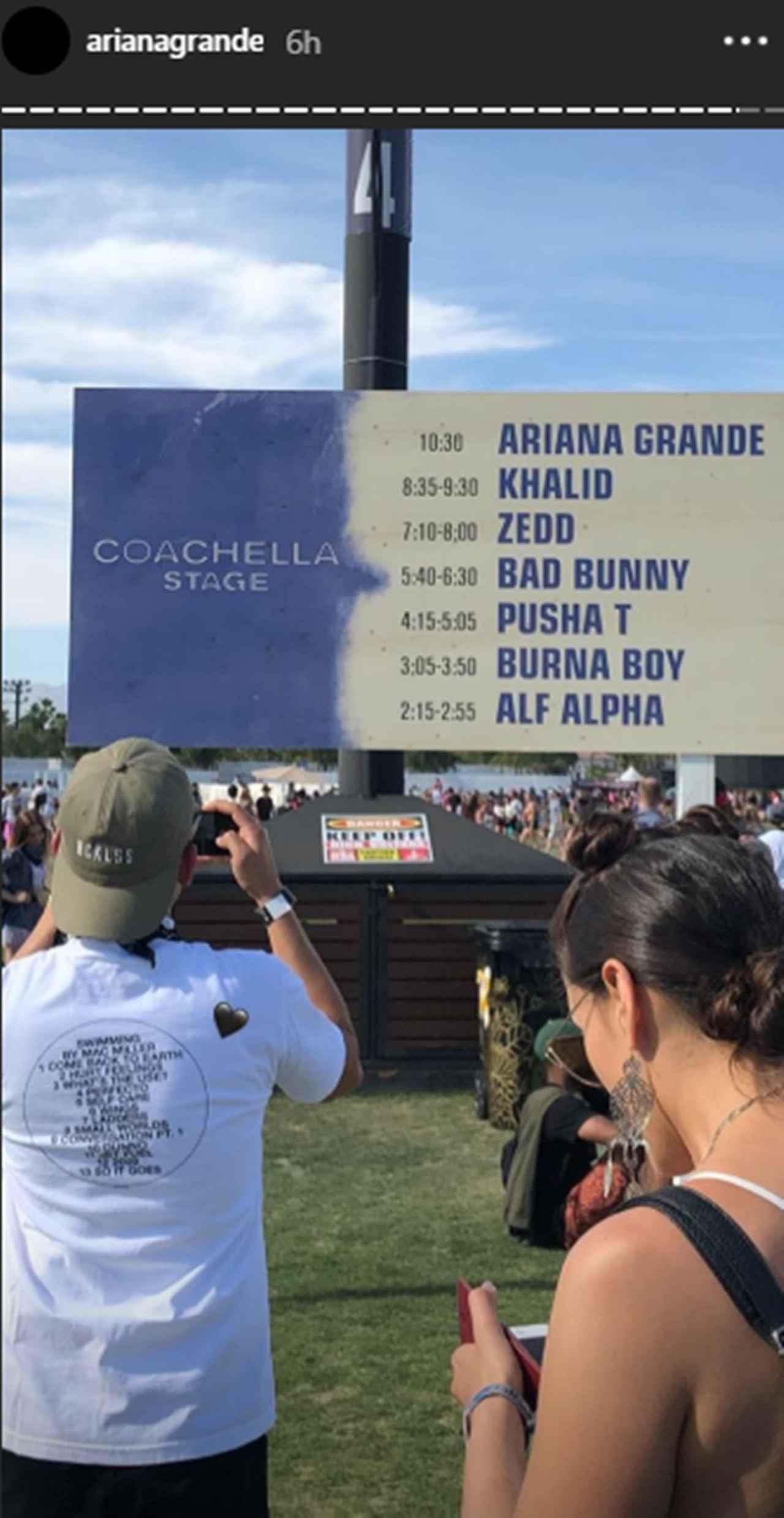 多くの人を魅了し、音楽通たちを唸らせたアリアナは、自身のインスタグラムに様々なコーチェラの思い出をアップしていたけれど、ある1枚の写真に注目。その写真は、3日目に出演するアーティストのタイムテーブルが書かれているボードという何気ない写真。