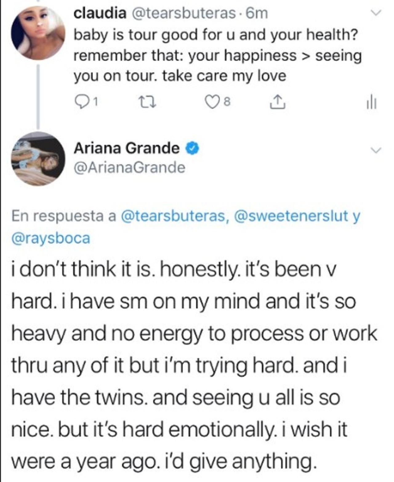 現在、『スウィートナー(Sweetener)』と『サンキュー、ネクスト(thank u, next)』というアルバム2作を引っさげた世界ツアーの真っ最中でもある彼女が、ツイッターでのファンとのやり取りの中で、思わぬ発言をして世間を心配させている。