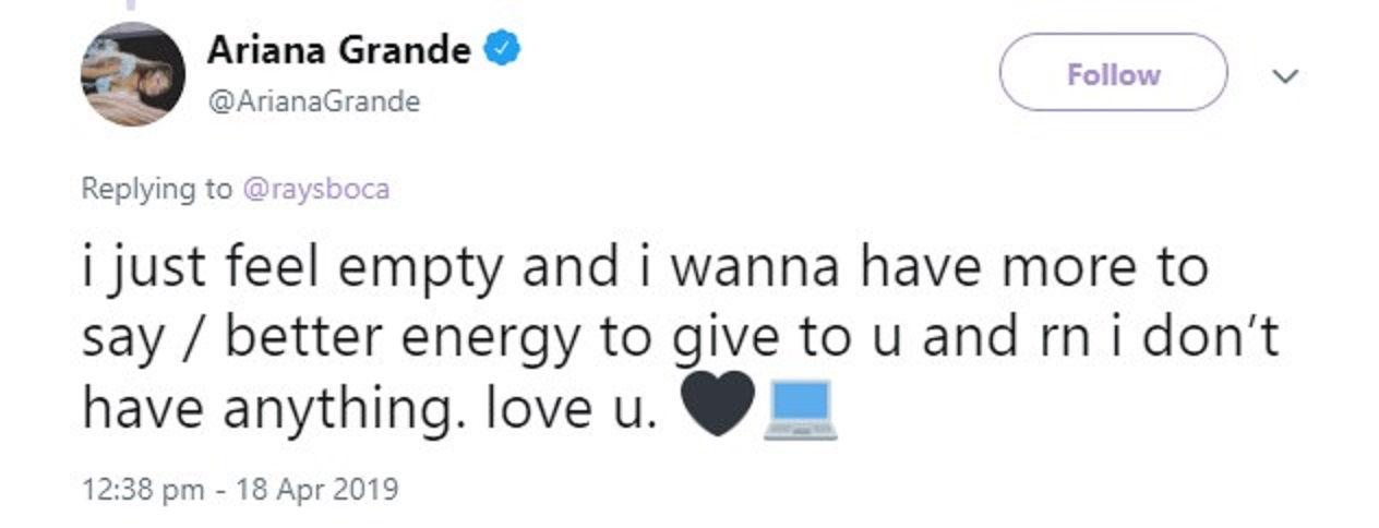 アリアナは、一連の発言を「今はなんだか空っぽな気分。何かもっと言えることがあったらいいのに。みんなにとってもっとポジティブになれるエネルギーとかね。でも、今の私には何もないの。愛してるわ」というコメントで締めくくっている。
