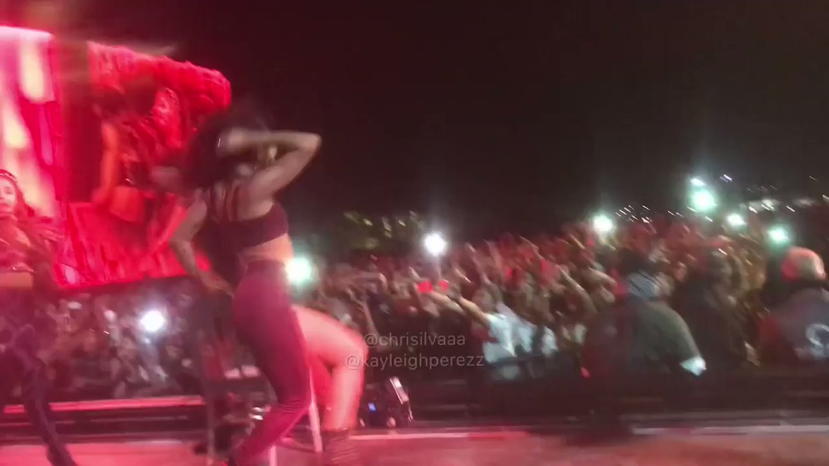 アリアナがサイドステージからメインステージに移動する途中で、観客のひとりがアリアナに向かってレモンを投げつけ、それが彼女の胸に直撃。