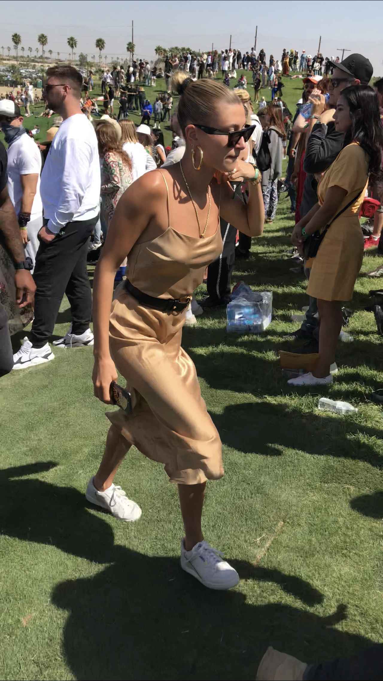 話題のモデル、ヘイリー・ビーバーは、ベージュゴールドのキャミワンピに、白スニーカーを合わせたセクシーなフェスコーデ。ワイドベルトでウエストマークしてきちんと感もプラスして。