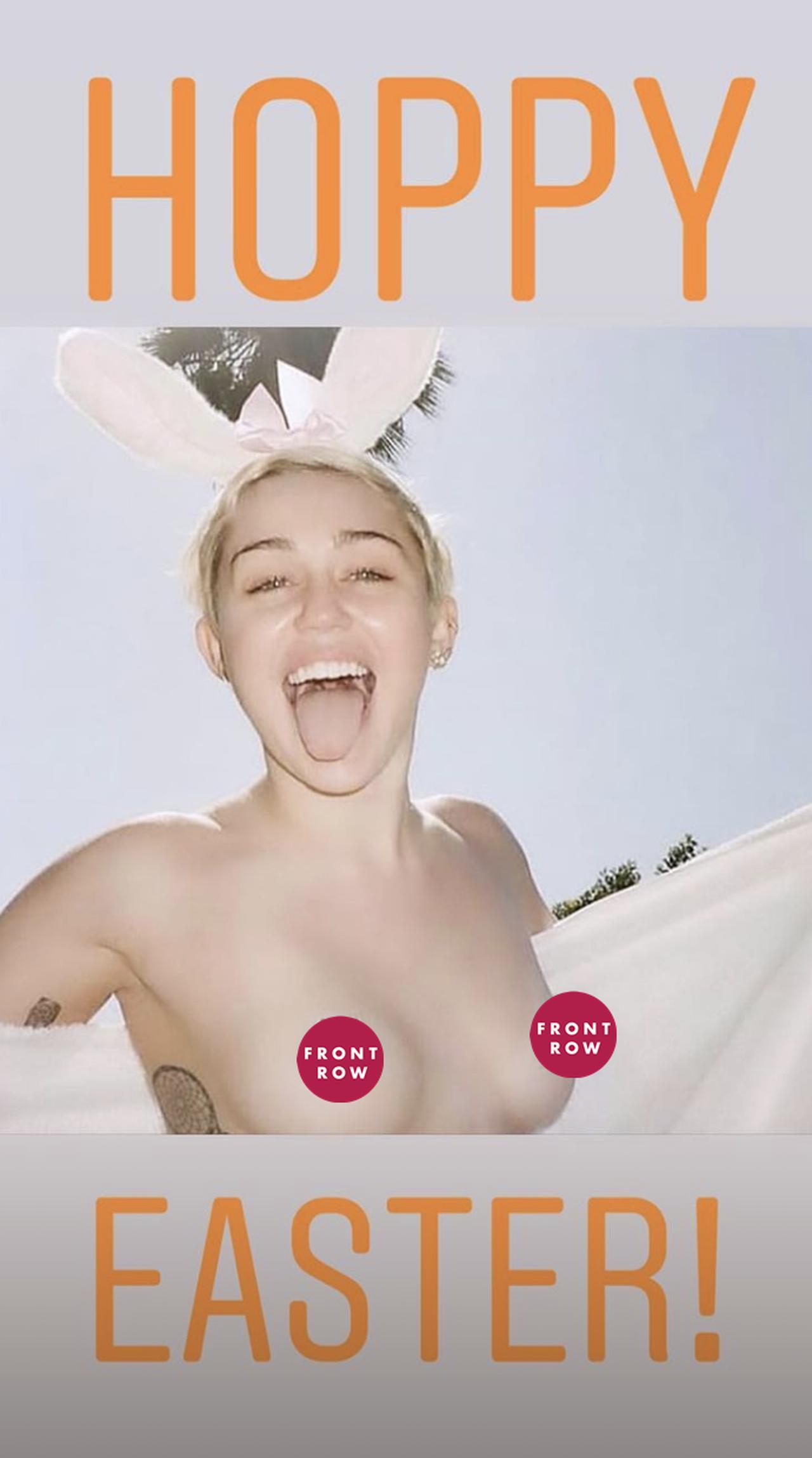 もとの写真のマイリーは、トップレス姿。乳首はウサギの絵文字で隠されているのだが、置き方が雑なのか、それともわざとそうしているのか、乳輪が少し見えてしまっていた。一応は宗教行事であるイースターを、なんとも破天荒にお祝いしたマイリー。