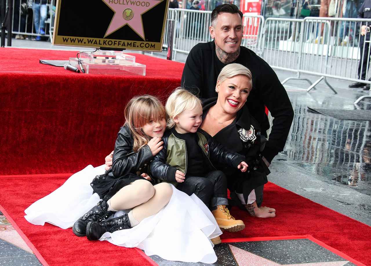 ハリウッドの殿堂入りを果たした際、「Walk of Fame(ウォーク・オブ・フェイム)」の星形の授与式に長女ウィローちゃんと長男ジェイムソンくん、そして夫で元モトクロスレーサーのケアリー・ハートを同伴したピンク。