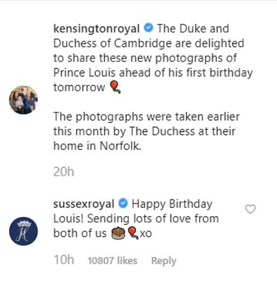 23日の誕生日当日に先がけて、キャサリン妃が自らが撮影したルイ王子の近影をケンジントン宮殿の公式インスタグラムを通じて公開したことは、先日フロントロウでもお伝えしたが、この何とも微笑ましい写真が投稿された直後、サセックス公爵であるヘンリー王子とその夫人であるメーガン妃が有する公式アカウント「@SussexRoyal」からコメントが。