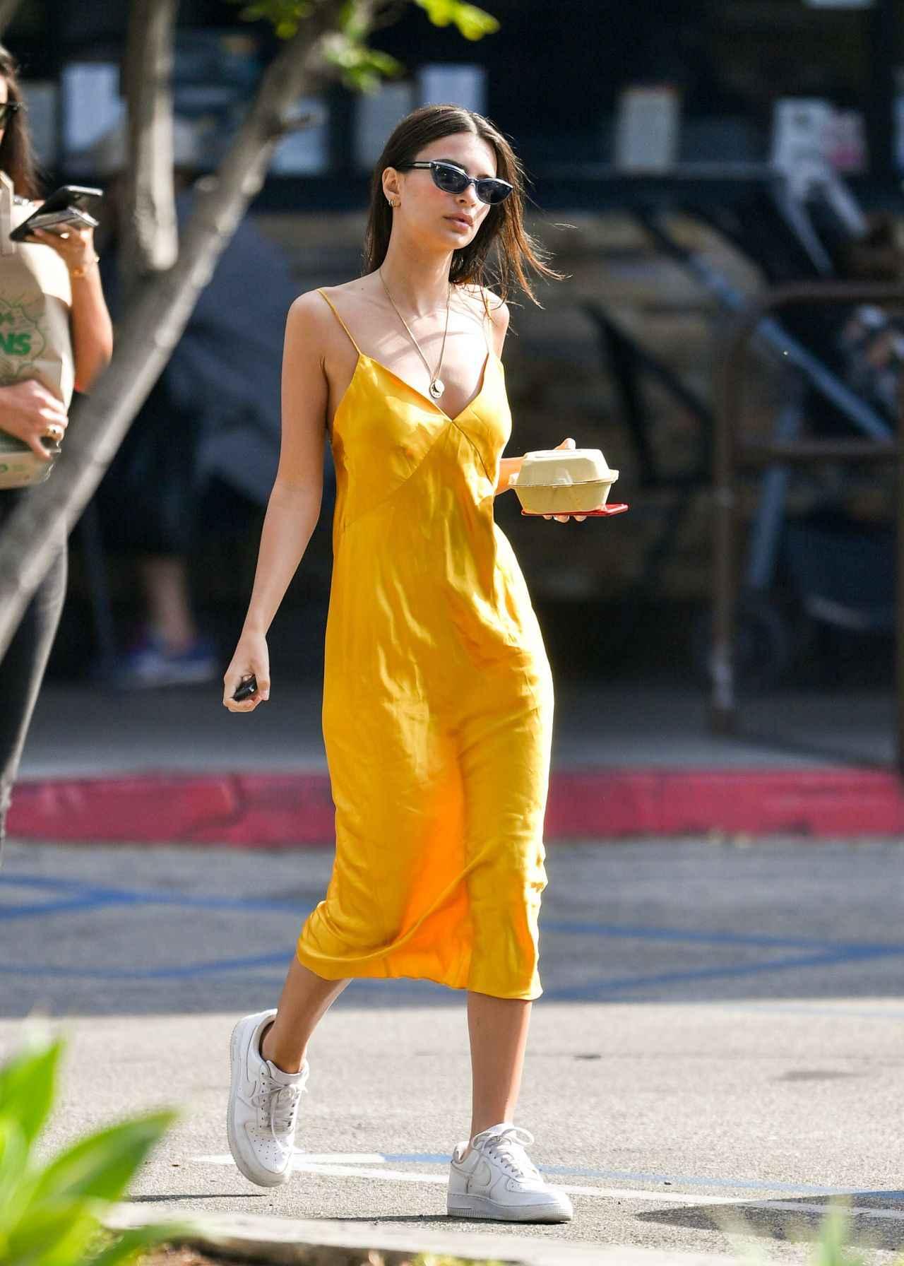 イエローのビタミンカラーが夏らしいサテンワンピに、ナイキの白スニーカーを合わせた人気モデルのエミリー・ラタコウスキー。Vネックに、ゴールドのロングネックレスでデコルテを華やかに飾って。